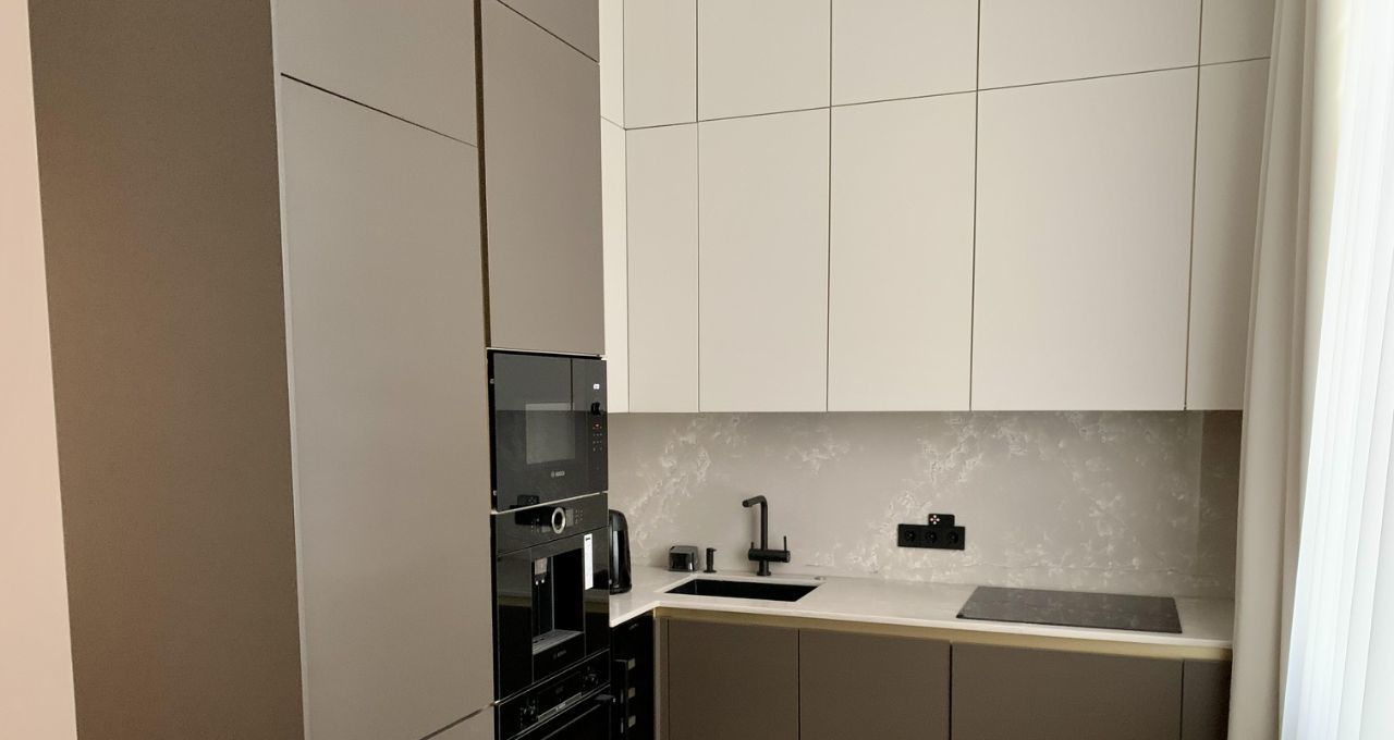 - стильная кухня со скрытым гарнитуром и всей необходимой техникой — удобно готовить и сервировать;