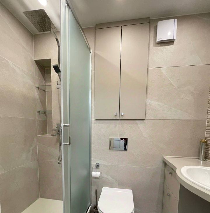 Ванная комната: современная, просторная душевая с каменным поддоном и раздвижными шторками, с нишей для косметических средств и тропическим душем. Унитаз, изящная столешница со встроенной раковиной, электрический полотенцесушитель, большое зеркало с подсветкой, тумбочка для мелочей, большой шкаф для хранения, корзина для белья. Крючки для полотенец.