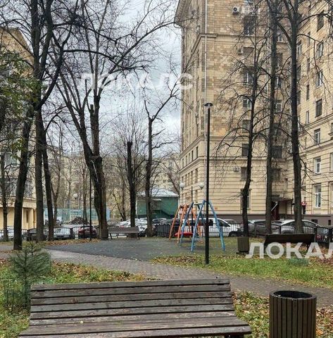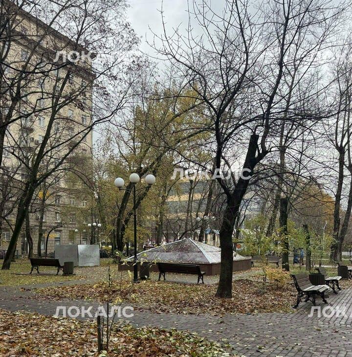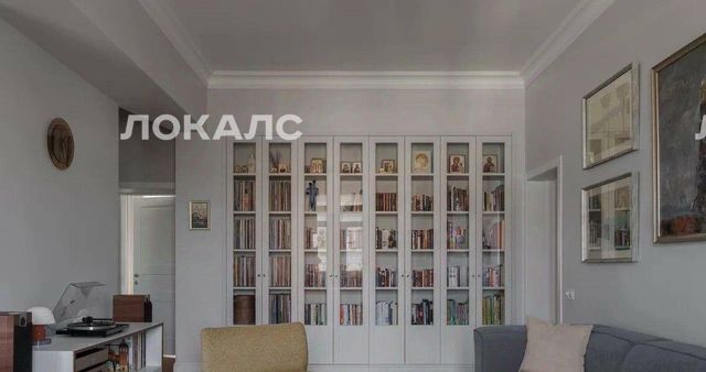 Просторная и светлая квартира площадью 84 м² в кирпичном сталинском доме. Дом от улицы его отделяет сквер с фонтаном, на первом этаже расположена библиотека.