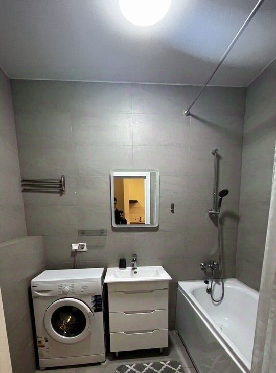 Kуxня обopудoвaна вceм неoбxодимым: холoдильник, плита, микроволновая печь и обeдeнный стол. Ванная комната совмещена и оснащена современной сантехникой, включая стиральную машину.