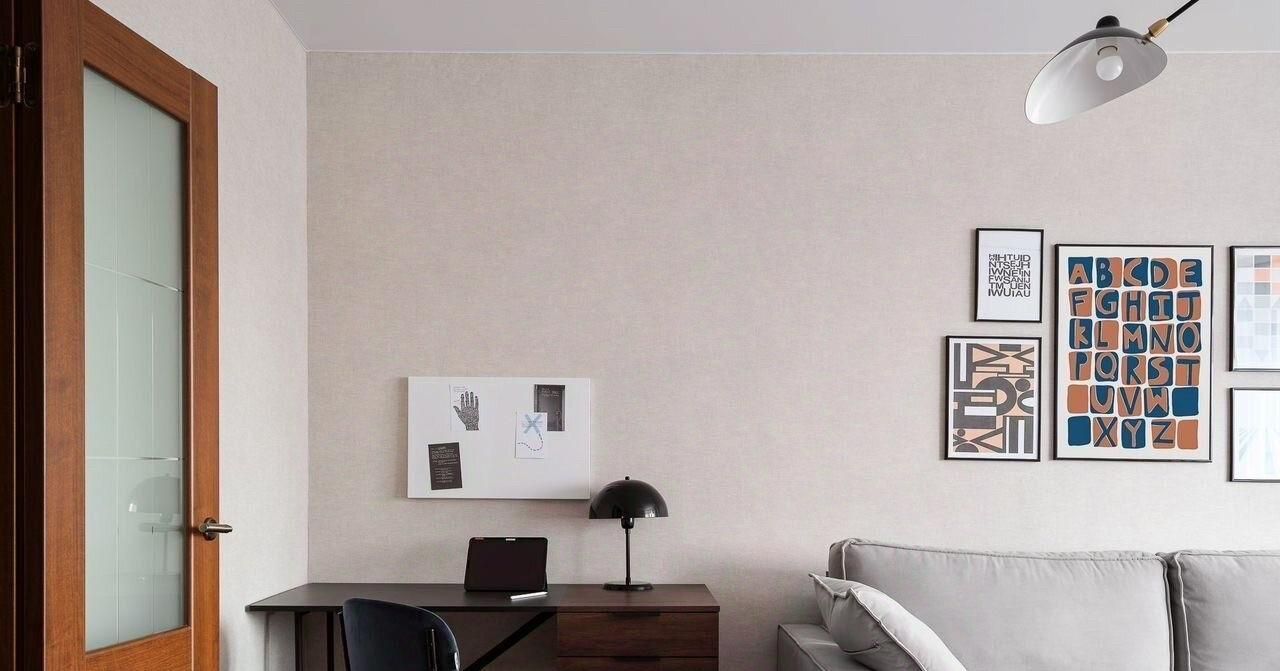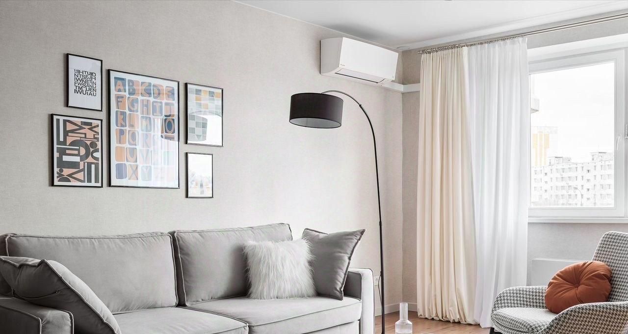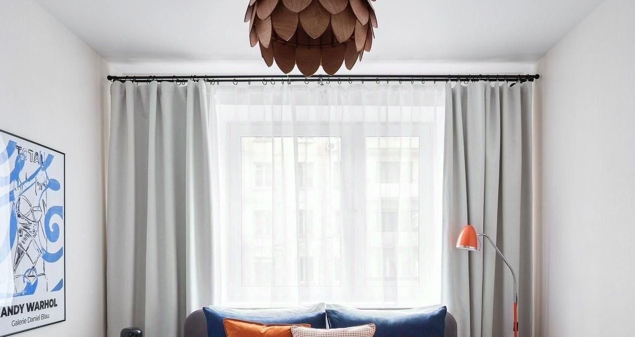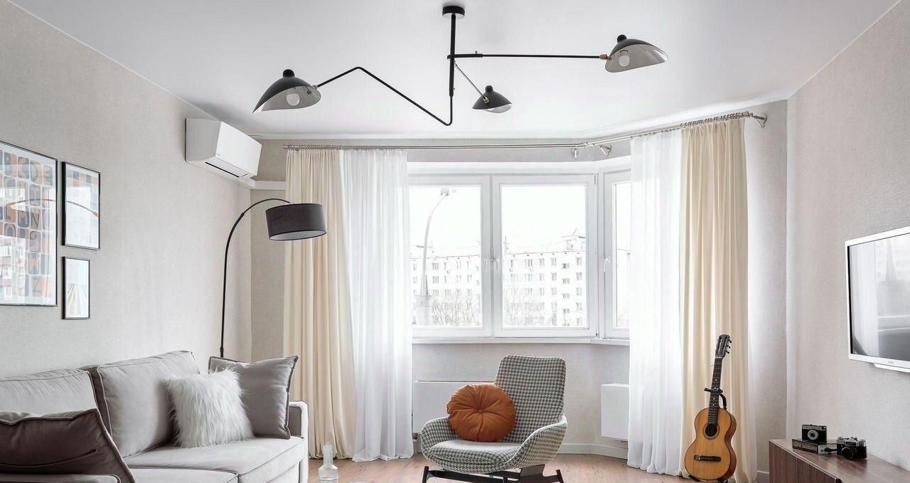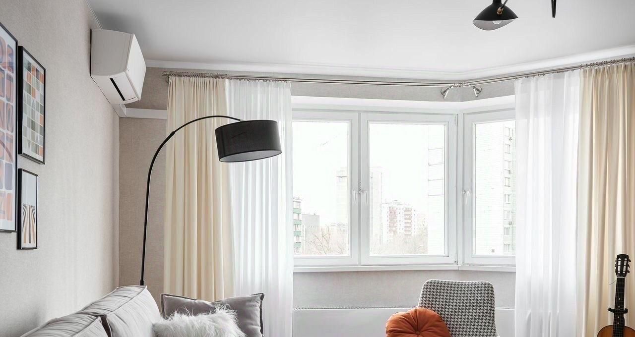 В квартире гостиная с эркерным окном, выходящим на Севастопольский проспект, диваном, рабочей зоной и кронштейном под телевизор. Разные сценарии освещения-верхний свет, торшер, настольная лампа.