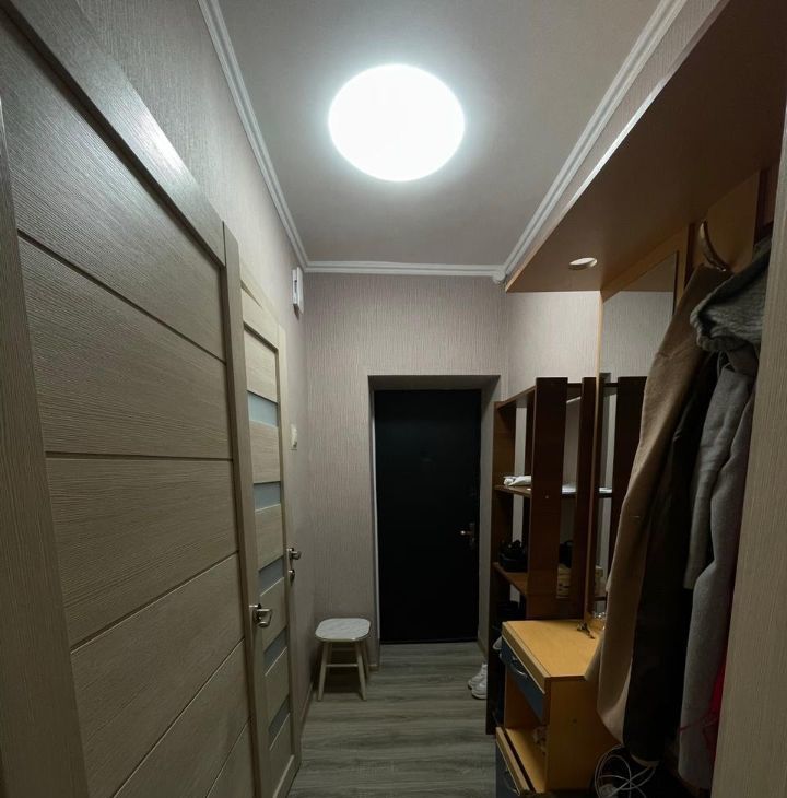 Кухня площадью 9 м² оборудована необходимой бытовой техникой, включая холодильник. В комнате установлен телевизор, а также имеется шкаф для хранения вещей. В прихожей предусмотрены удобные шкафы для одежды.