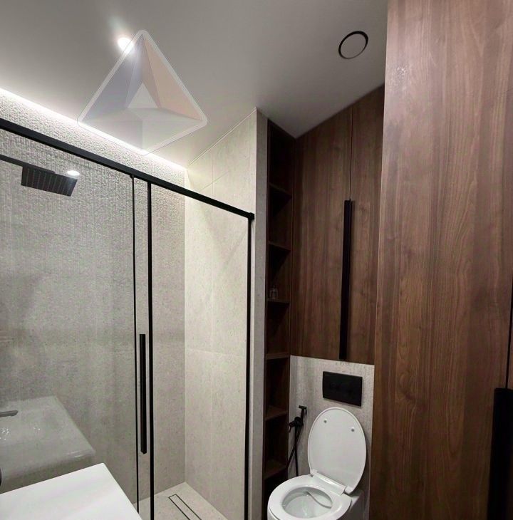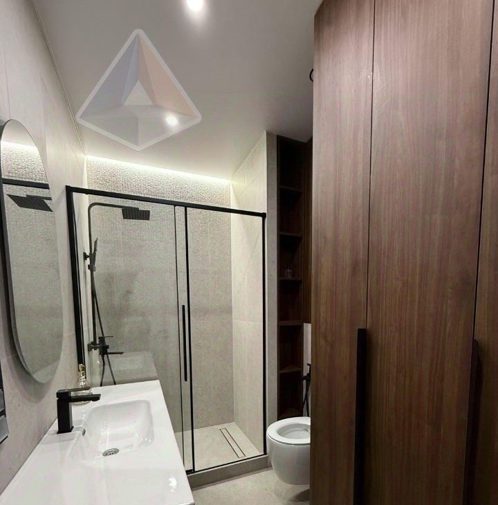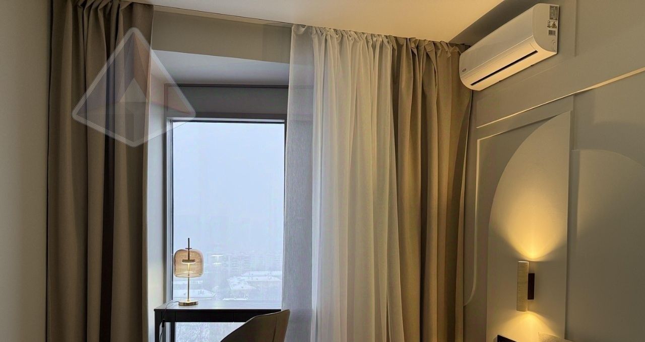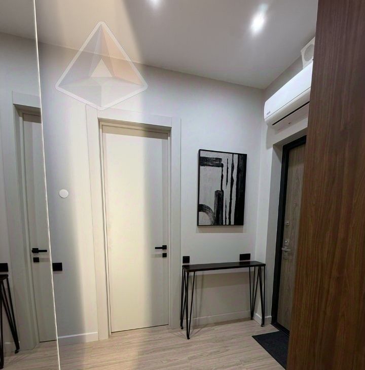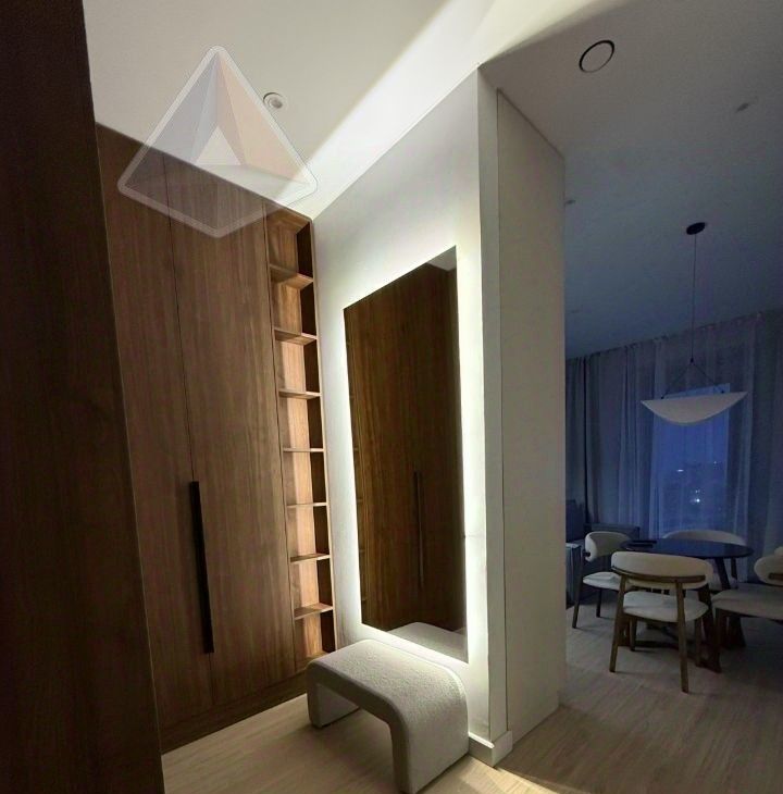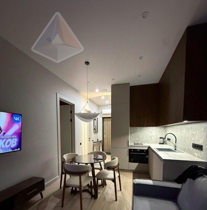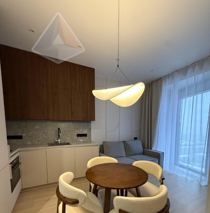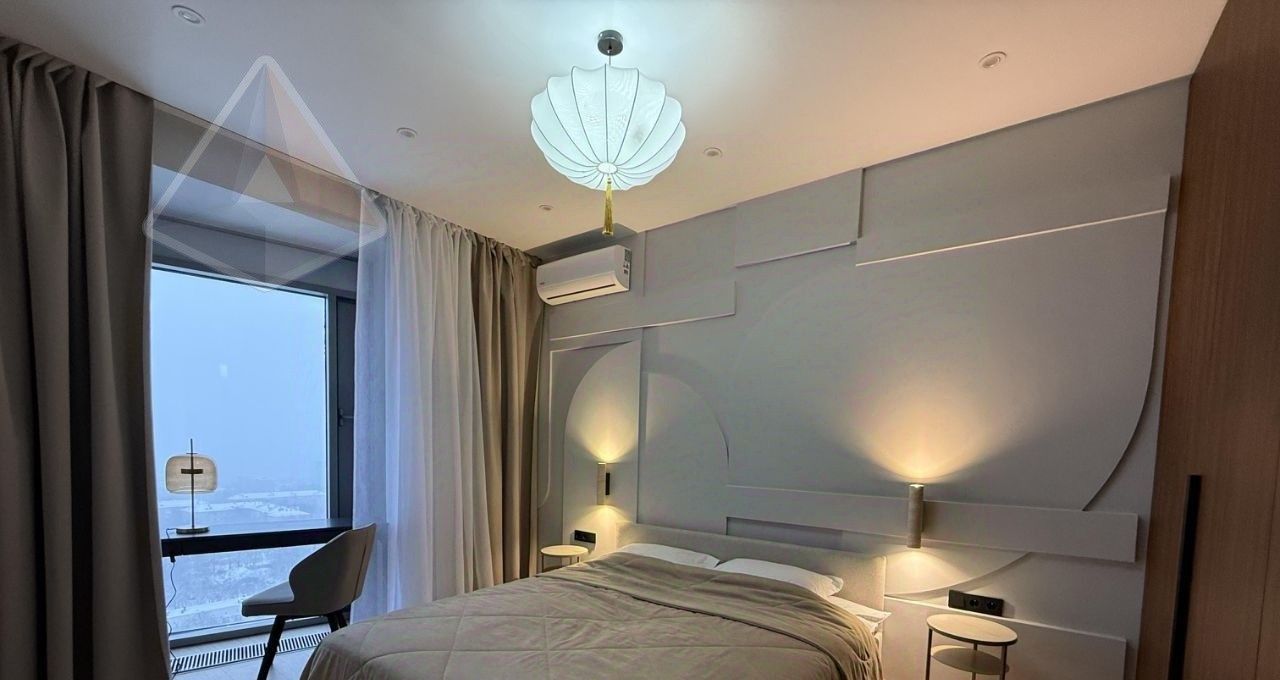Новая квартира 45 м² на высоком 20 этаже (потолки 3 м): прихожая, кухня-гостиная, отдельная спальня (жилая площадь 40 м²), совмещённый санузел с душевой. Дизайнерский ремонт, панорамные окна с видом на город, встроенные системы хранения. Полный комплект мебели и техники: посудомоечная машина, духовой шкаф с СВЧ, варочная панель, холодильник, стиральная машина с сушкой, робот-пылесос, кондиционер, смарт-ТВ, Wi-Fi — заселяйтесь с чемоданами.