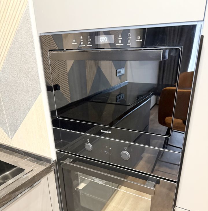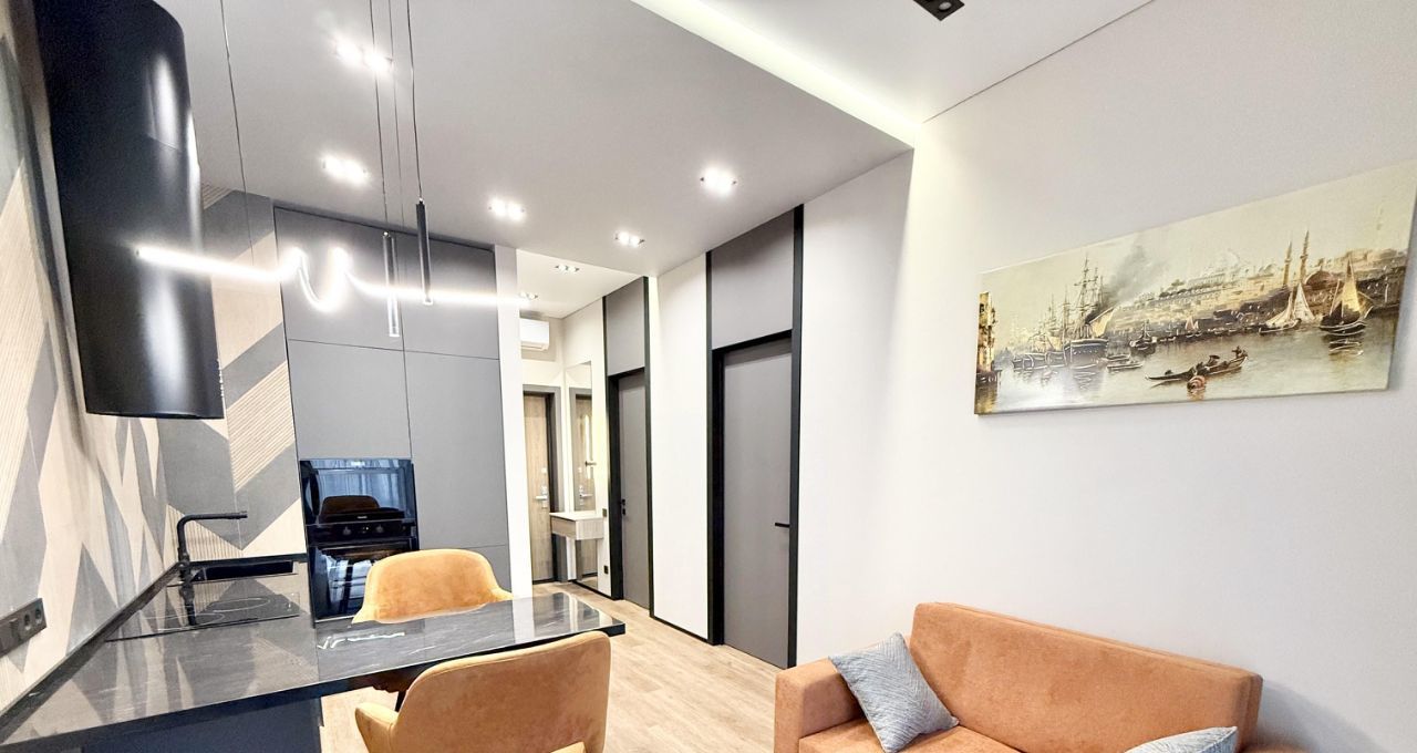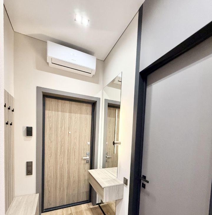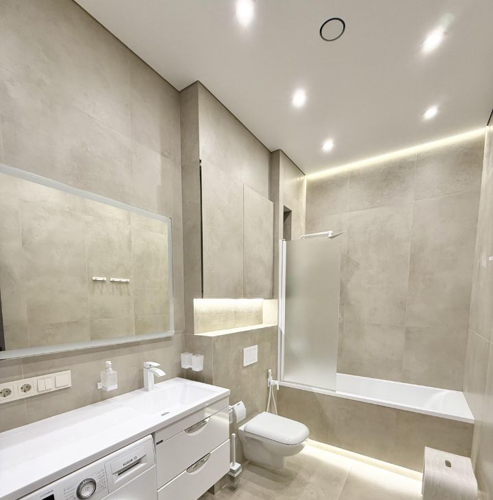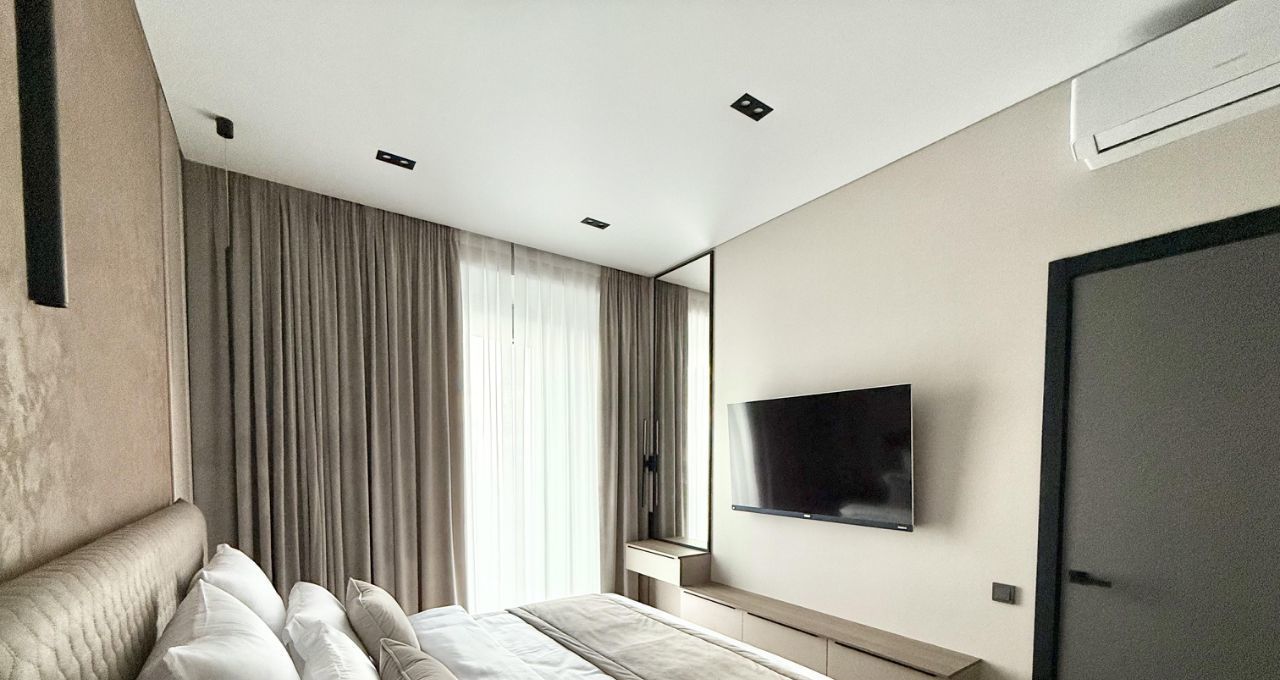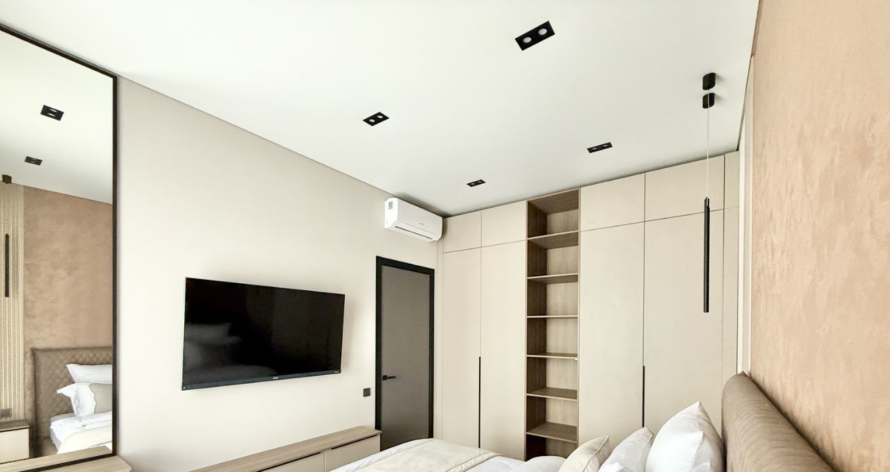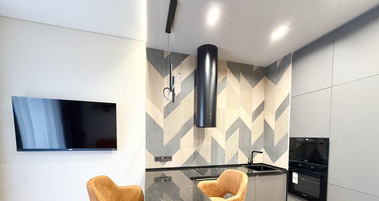 В квартире выполнен дизайнерский ремонт, который подчеркивает современный стиль интерьера. Квартира полностью меблирована: мебель есть как на кухне, так и в комнатах. В наличии вся необходимая техника для комфортного проживания: кондиционер, холодильник, посудомоечная машина, телевизор и стиральная машина. Совмещенный санузел оборудован ванной, что добавляет уюта и удобства.