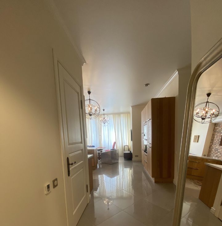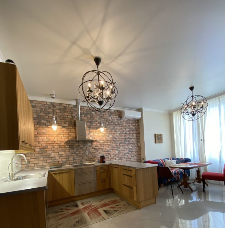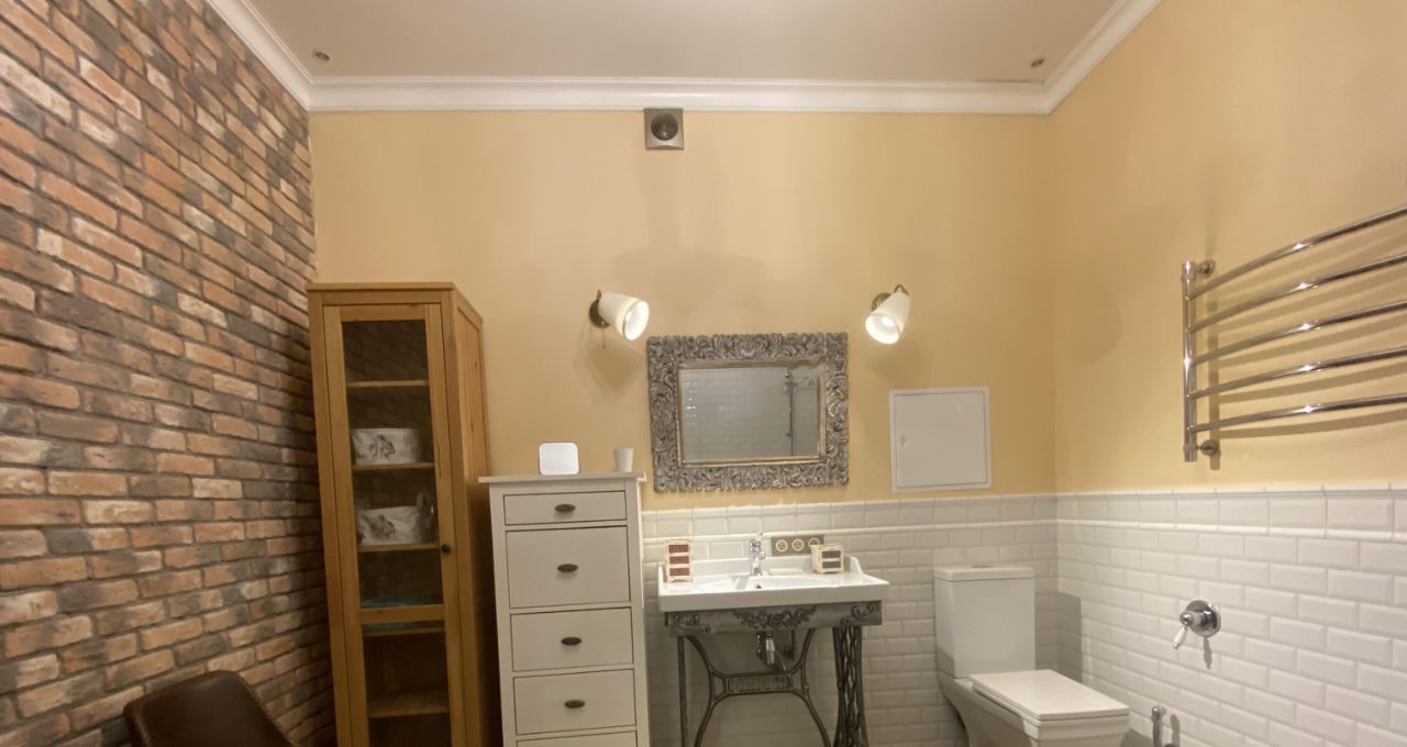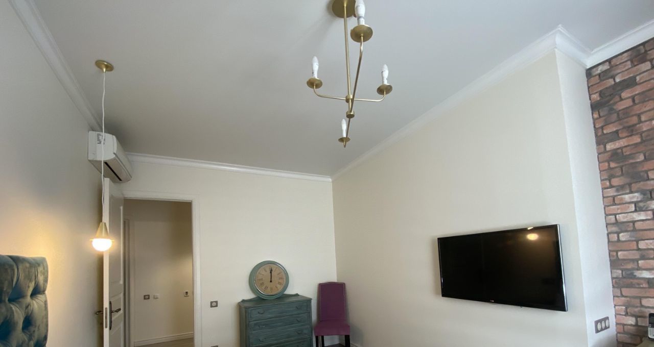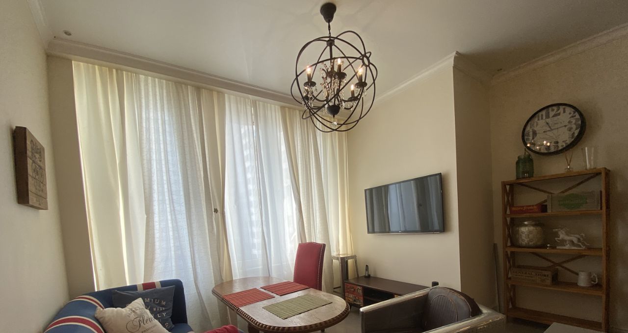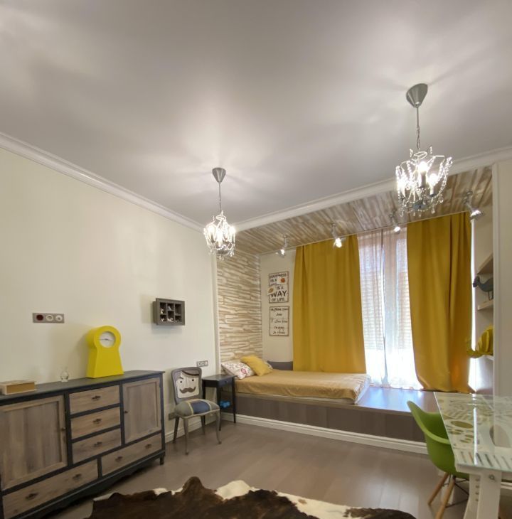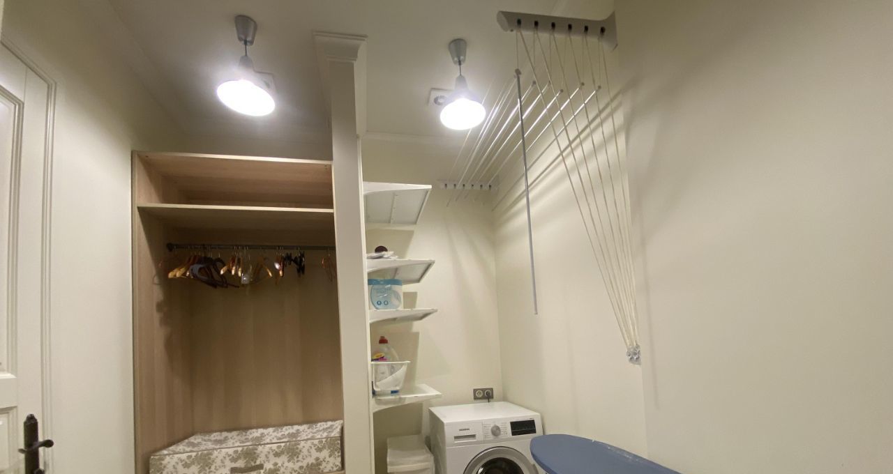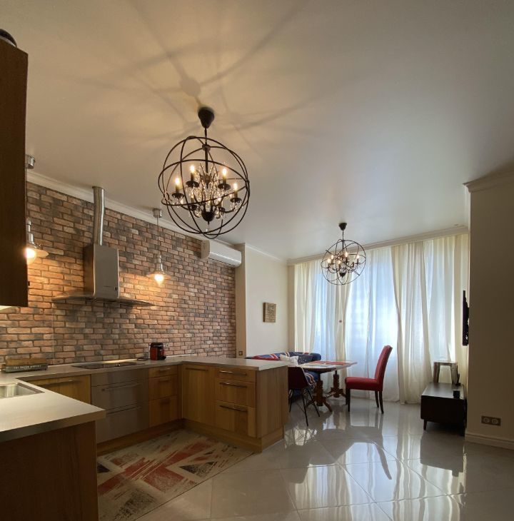 В квартире выполнен дизайнерский ремонт с использованием качественных материалов. В каждой комнате есть мебель, а на кухне установлен полный комплект техники: кондиционер, холодильник, посудомоечная и стиральная машины, телевизор. Два совмещенных санузла оборудованы ванной и душевой кабиной, что позволит с комфортом разместиться даже большой семье. Окна выходят во двор, поэтому в квартире тихо и спокойно.