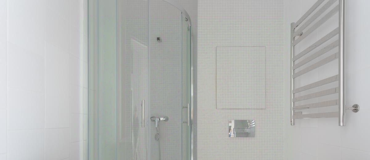 Санузел с душевой кабиной и стиральной машиной.