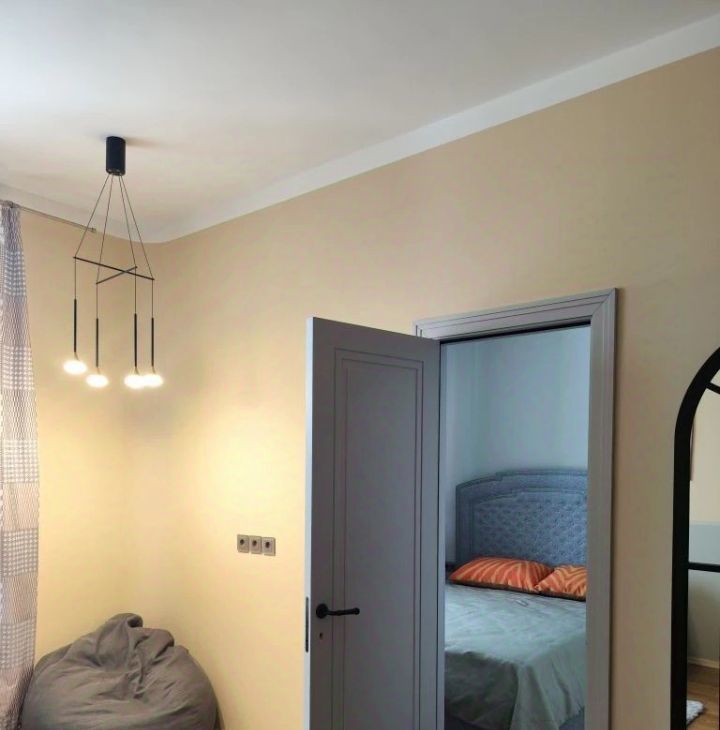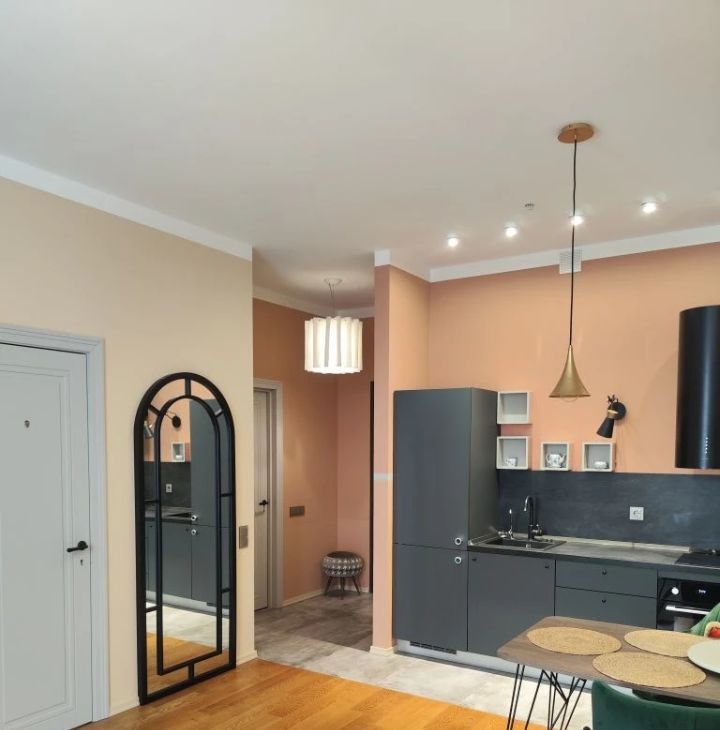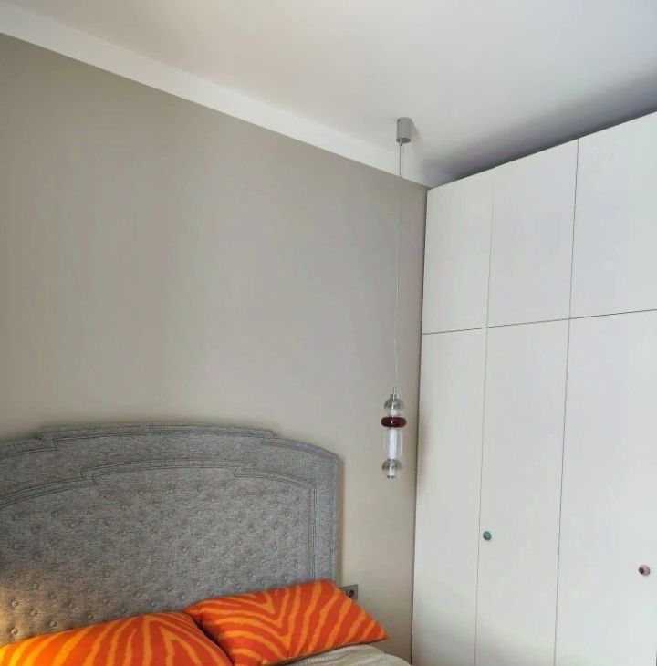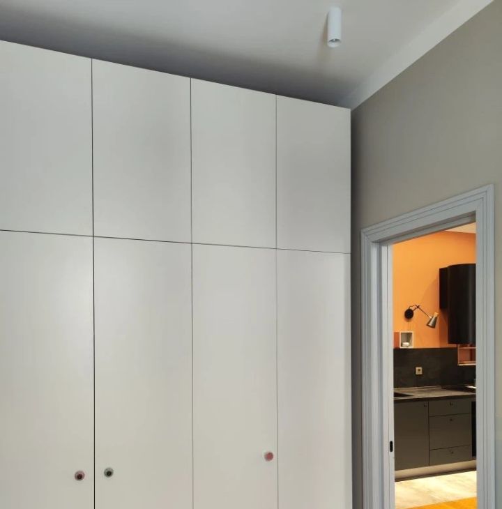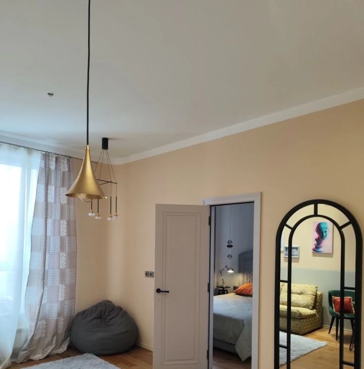 Кухня-гостиная для медленных завтраков и вечеров с друзьями. Спальня — тихая, с мягким светом и очень вместительным шкафом. Высокие потолки.