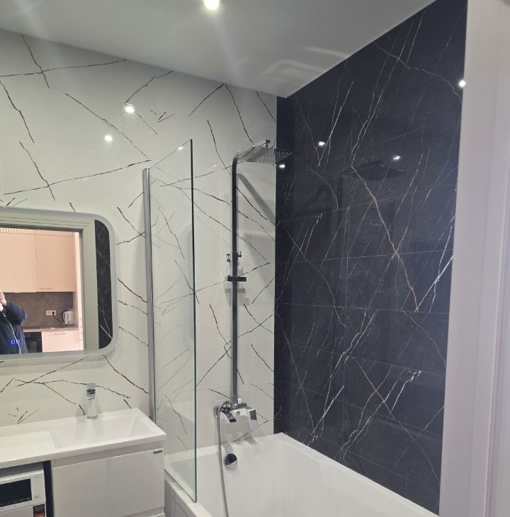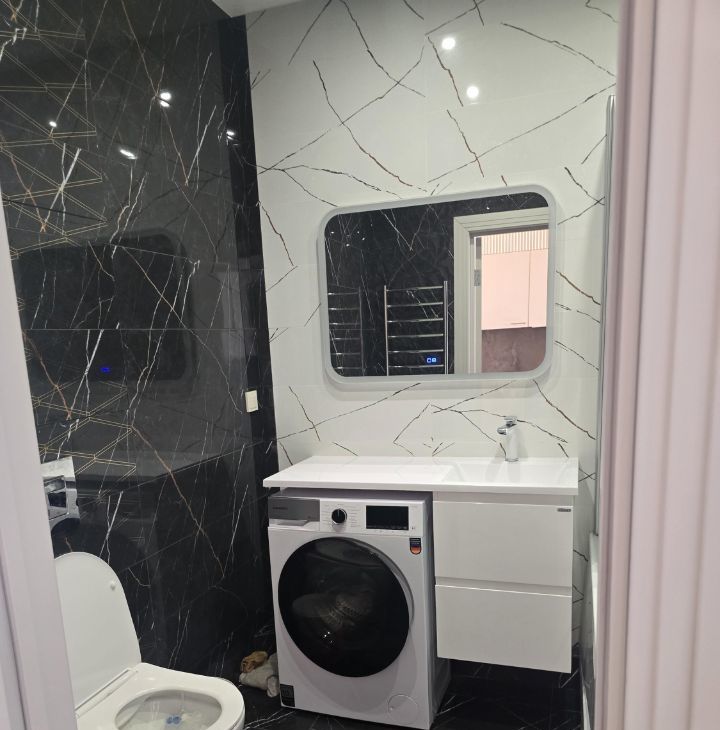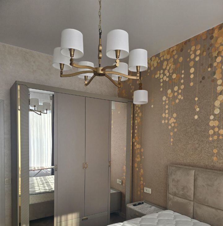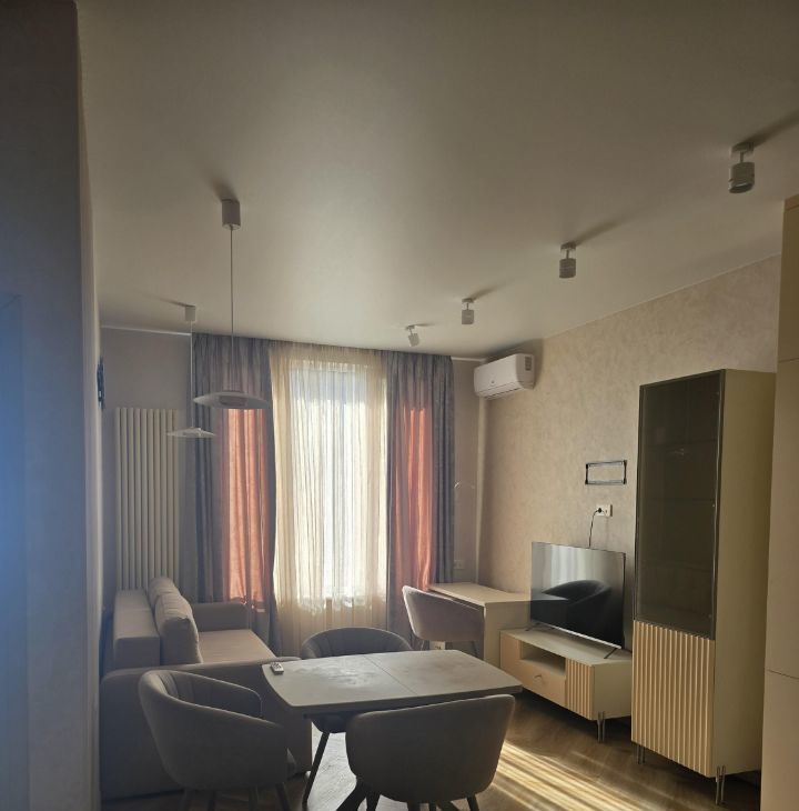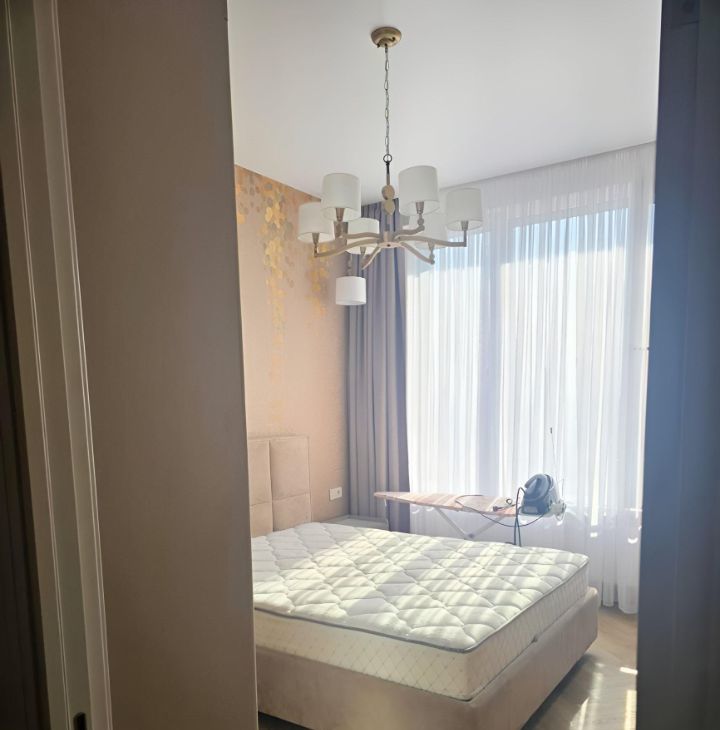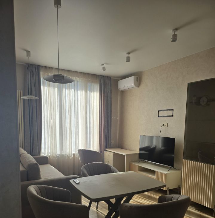 Квартира с дизайнерским ремонтом, полностью готова к проживанию. В комнатах и на кухне есть необходимая мебель. Из техники — 2 кондиционера, холодильник, посудомоечная машина, 2 телевизора, стиральная машина, микроволновая печь, чайник, парогенератор. На кухне есть вся необходимая посуда. Санузел совмещённый, оборудован ванной.