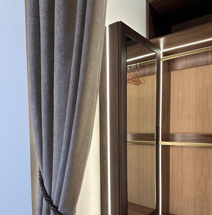 Мастер-спальня с большой кроватью, гардеробной комнатой, электрошторы на пульте, телевизор. В просторной ванной комнате разместили ванну, стиральную и сушильную машины, станцию Алиса.