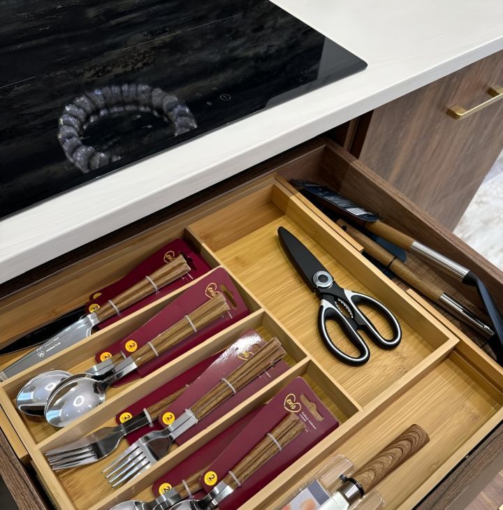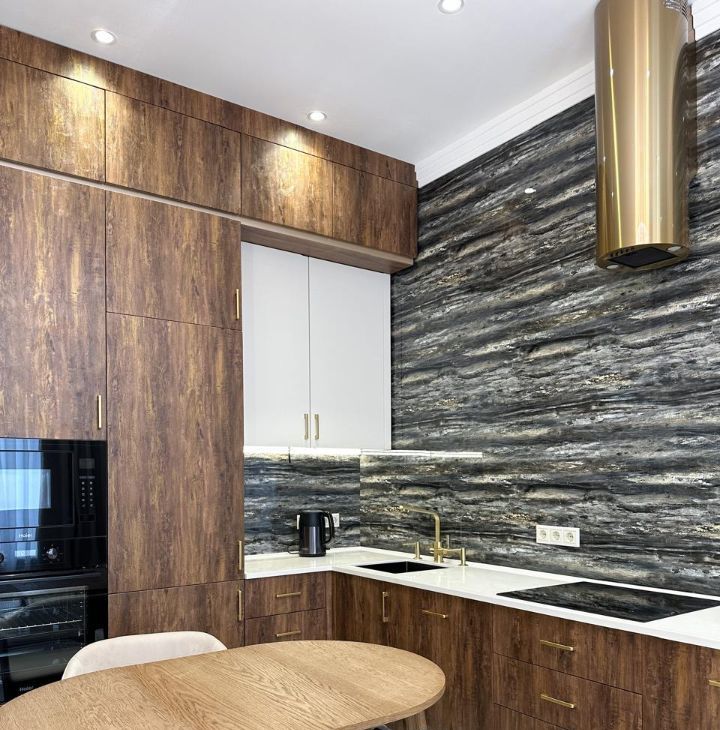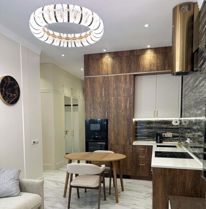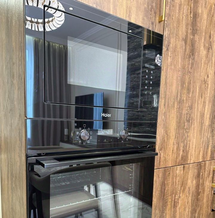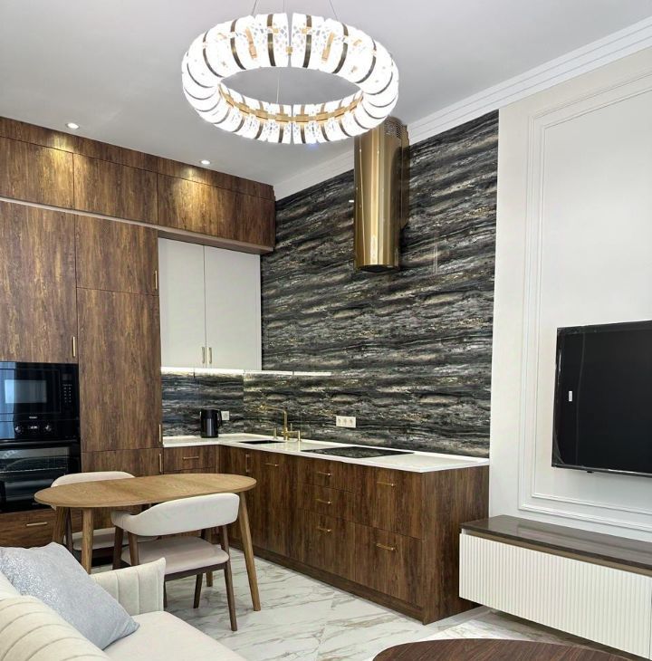 Кухня совмещена с гостиной, техника вся новая : посудомоечная машина, встроеный духовой шкаф, микроволновая печь, телевизор, диван раскладной, стол раскладной, стулья, посуда.