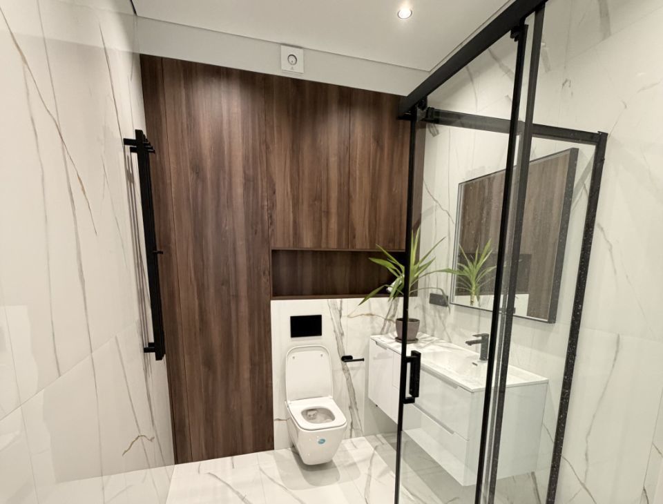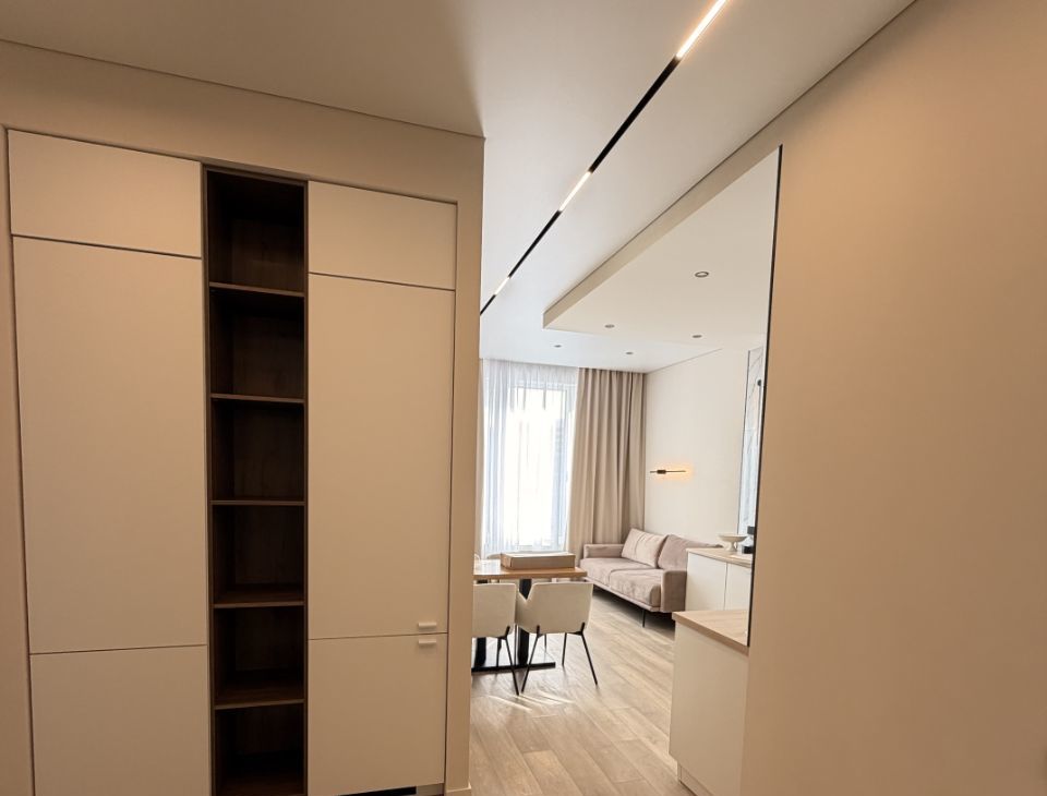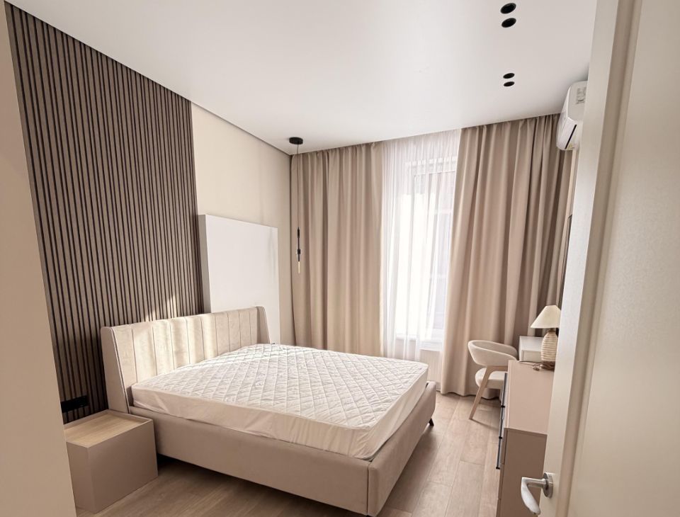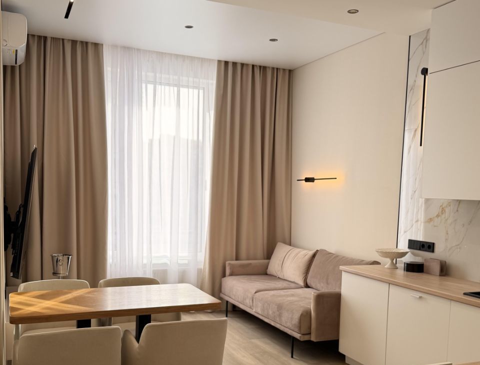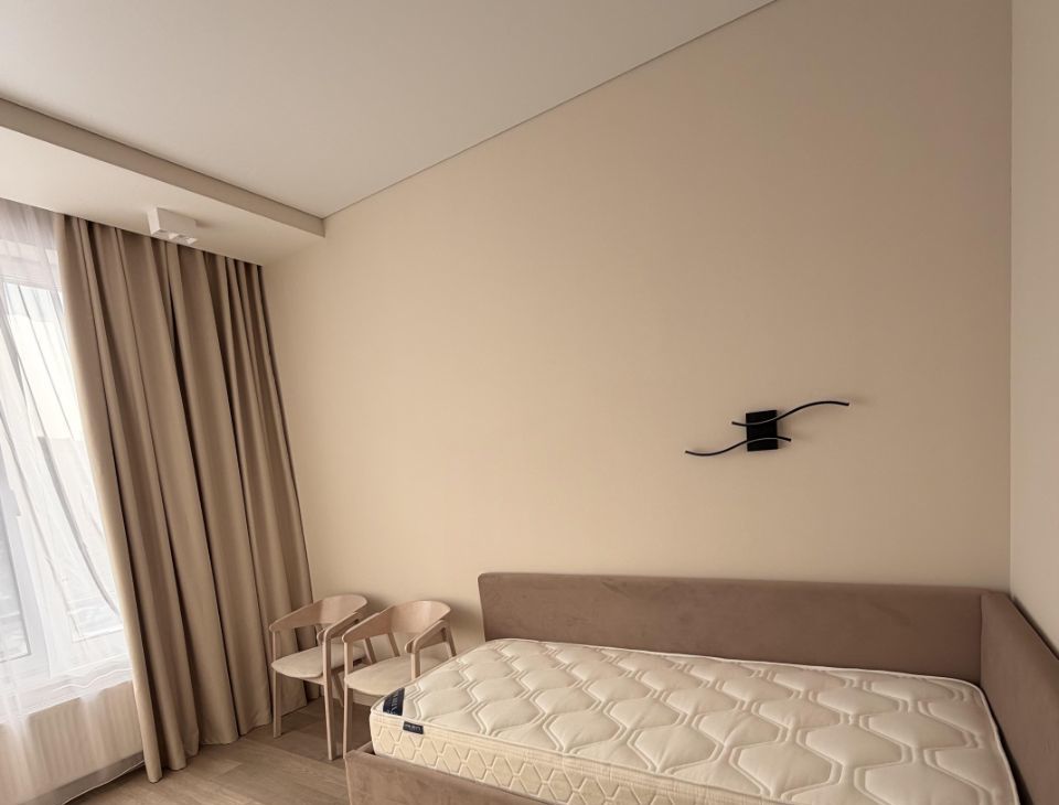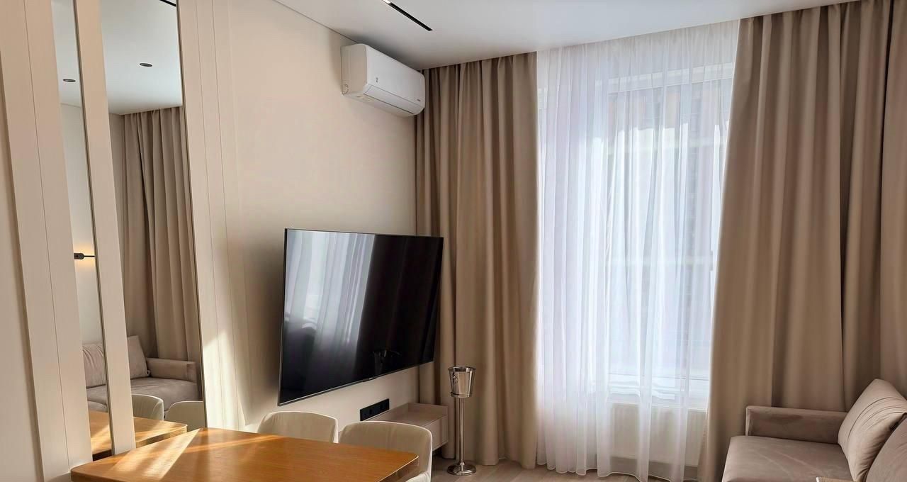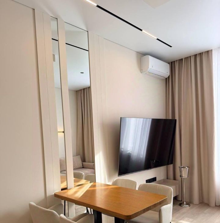 В квартире сделан современный ремонт, она полностью меблирована. На кухне и в комнате есть вся необходимая мебель. Из техники в вашем распоряжении кондиционер, холодильник, посудомоечная машина, телевизор и стиральная машина. Удобная планировка включает совмещенный и отдельный санузел, а также ванную комнату с душевой кабиной. Окна выходят во двор, поэтому в квартире всегда тихо и спокойно.