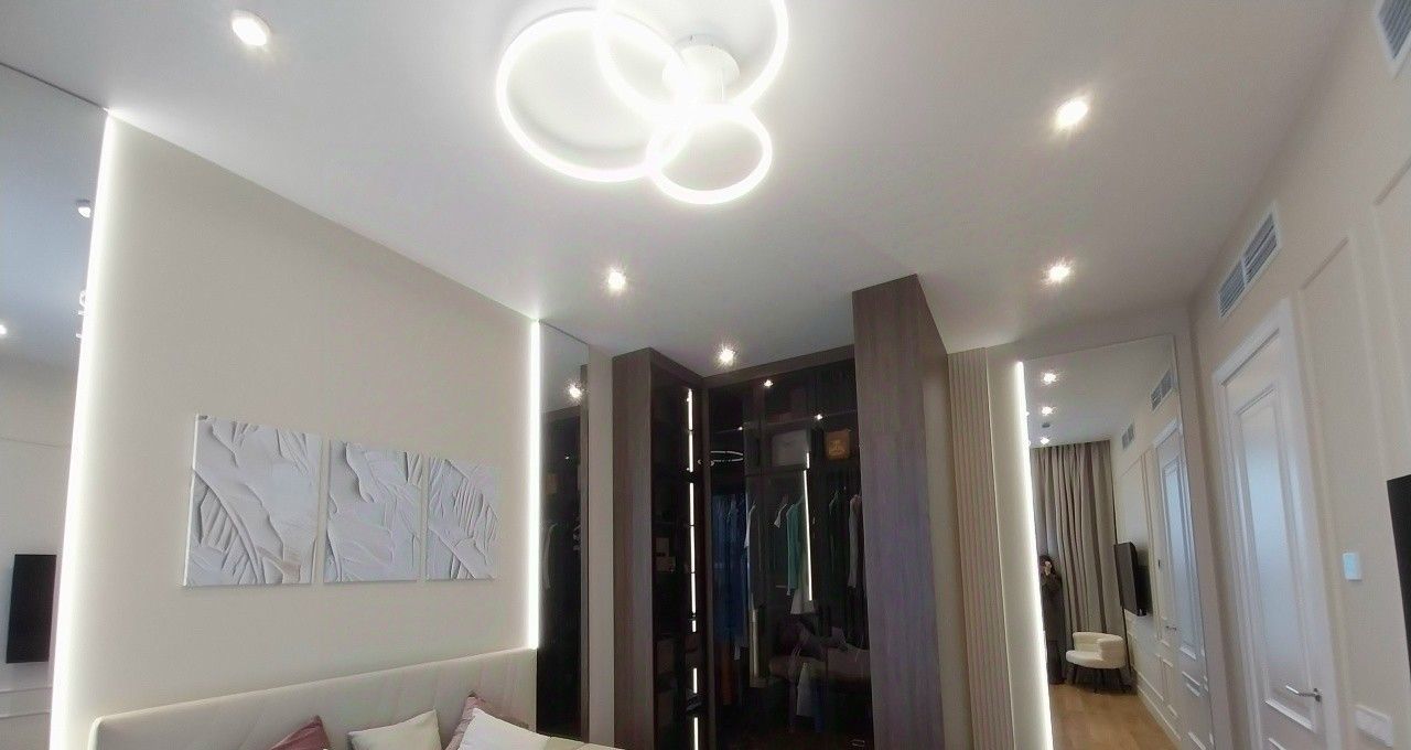 В спальне расположена полноценная красивая современная гардеробная. Вся мебель новая, встроенная, сделана на заказ, с красивой подсветкой.
