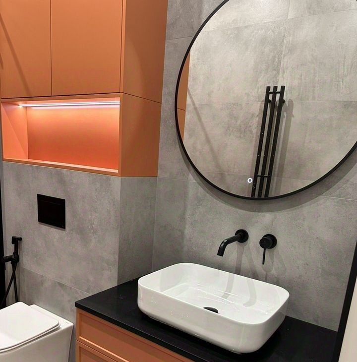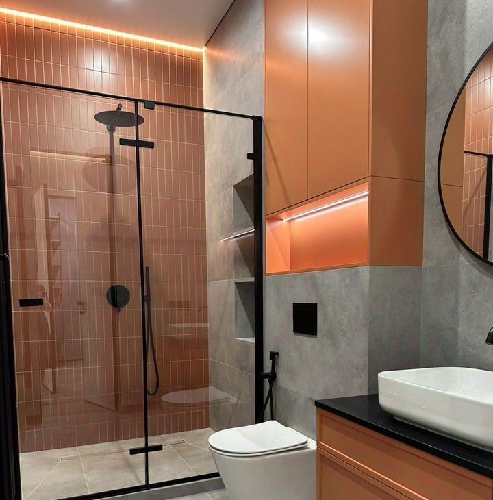 Совмещенный санузел выполнен в современном стиле с душевой кабиной и стильной сантехникой.