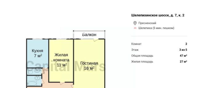 В 3-4 минутах ходьбы от метро "Шелепиха" предлагается двухкомнатная квартира. Жилые комнаты удобно меблированы: предусмотрены диваны и вместительные шкафы для хранения вещей. Кухня оборудована функциональным гарнитуром и комплектом современной техники, включая духовую и микроволновую печи. Установлена стиральная машина. Есть балкон. Окна выходят на тихий двор.