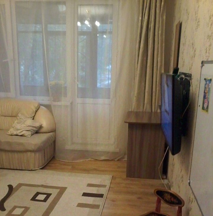 В комнатах - качественная мебель. В спальне - удобная двуспальная кровать и объемный шкаф. В детской - удобный светлый диван, раскладной стол, стулья, доска.