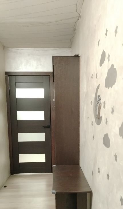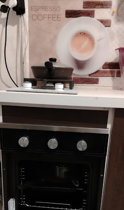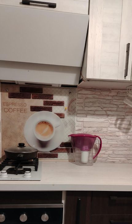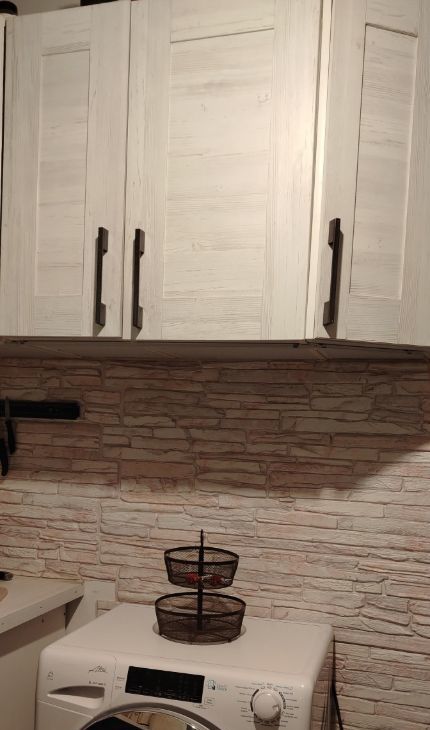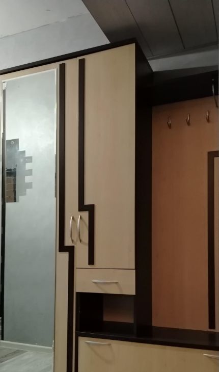 Небольшая прихожая зона с шкафом для верхних вещей. На кухне вся необходимая мебель и бытовая техника: газовая плита и вытяжка, а также кухонный гарнитур с обеденным столом, вместительный холодильник, микроволновка, полочки для декора или специй, посуда.