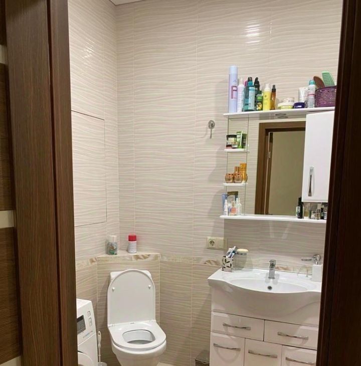 Просторный санузел: ванная, туалет, ванный гарнитур, стиральная машина