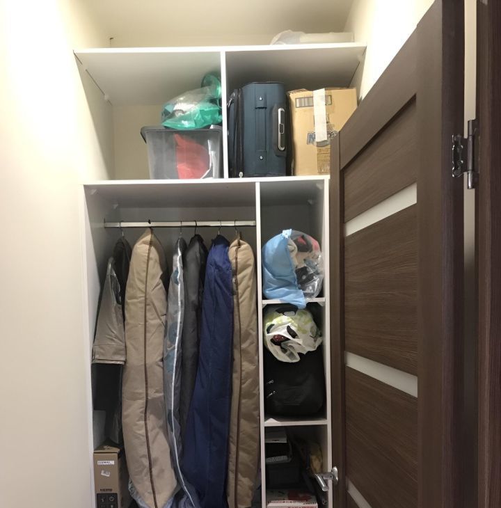 Так же есть отдельная гардеробная комната, куда отлично поместятся вся верхняя одежда, чемоданы, мелкая бытовая техника и прочее, тем самым само жилое пространство будет максимально воздушное и свободное.