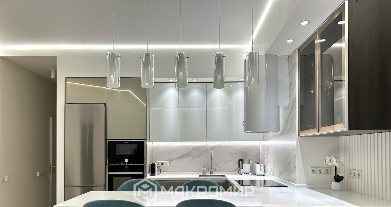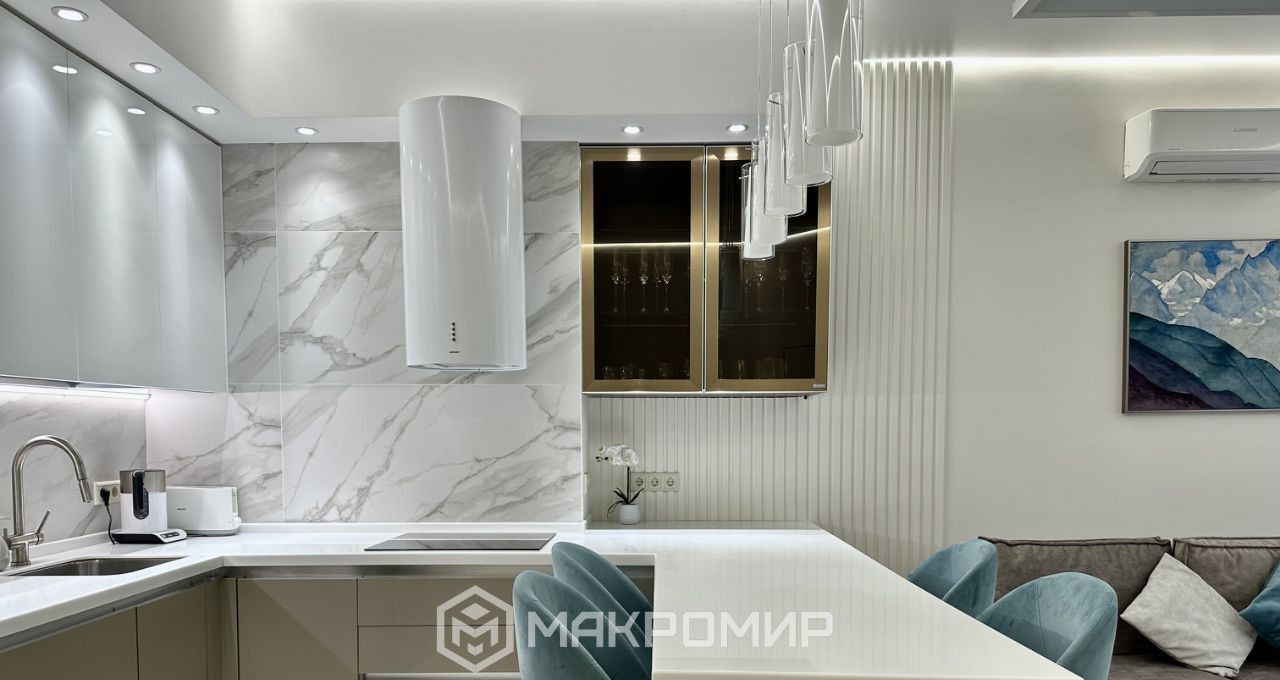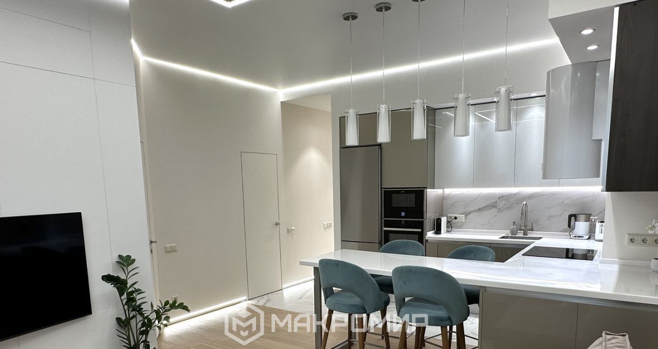 В квартире дизайнерский ремонт. Каждая деталь продумана. Пространство ощущается гармонично и легко.