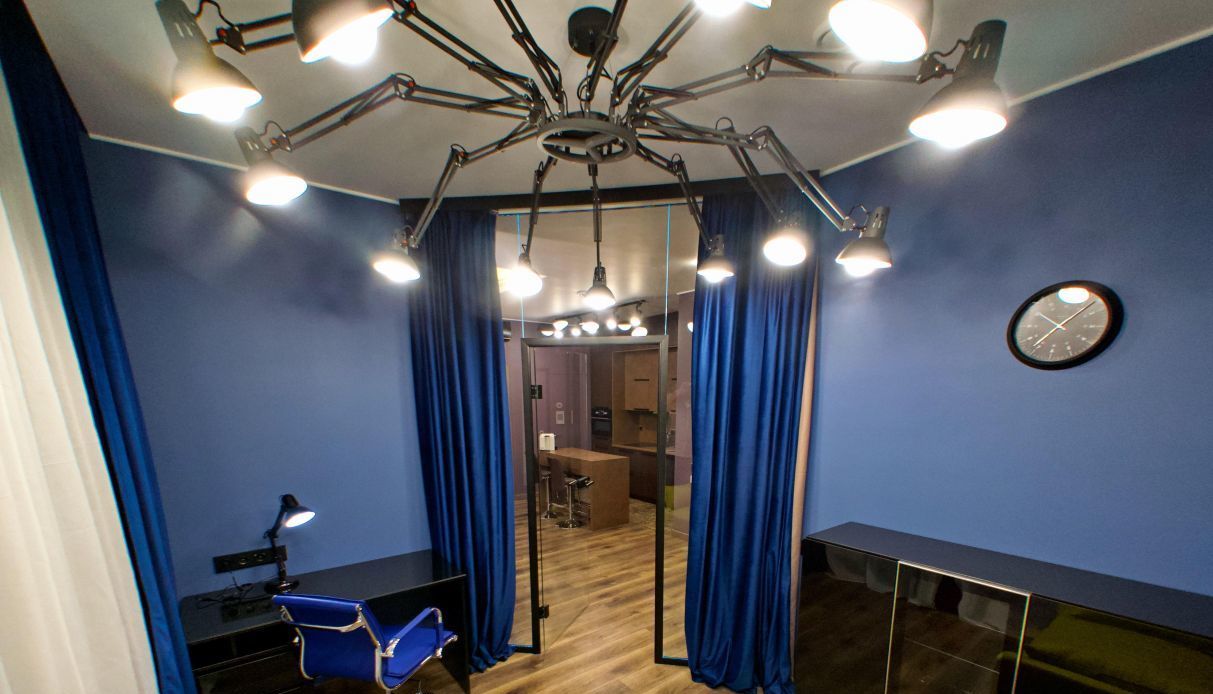 Кабинет отделён стеклянной звукоизоляционной перегородкой, установлен раскладной диван и рабочий стол. Кабинет можно использовать как жилую комнату или детскую.