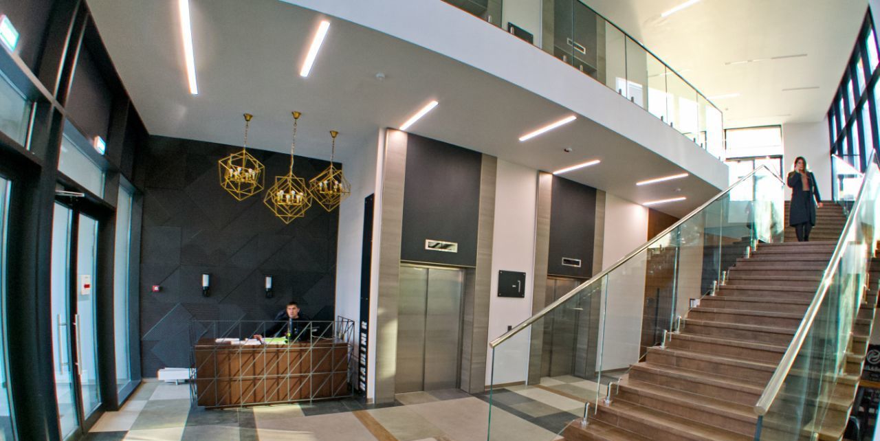 На 1 этаже входная группа, лобби, шикарный холл для жителей башни, диваны, камины, место для встреч, кофейня прямо в холле подъезда. Прекрасное удобное место для жизни и работы.