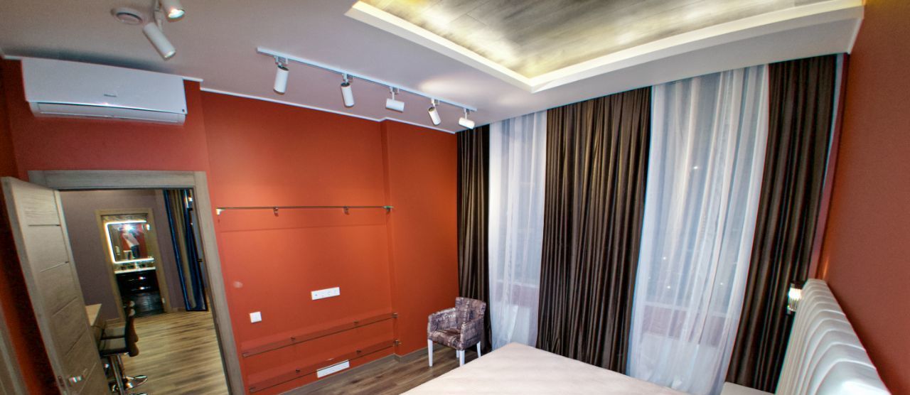 В спальне большая двуспальная кровать, ТВ и туалетный столик. К спальне примыкает вместительная гардеробная, которая оборудована стеллажами для хранения и стиральной машиной с функцией сушки. Из гардеробной можно также выйти в гостиную.