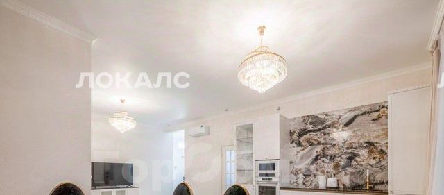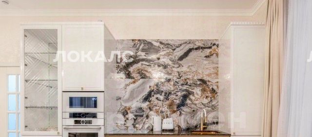 посудомоечная машина, индукционная плита, встроенный духовой шкаф, микроволновая печь, холодильник Liebherr. Обеденный стол с мраморной столешницей, обеденные стулья.