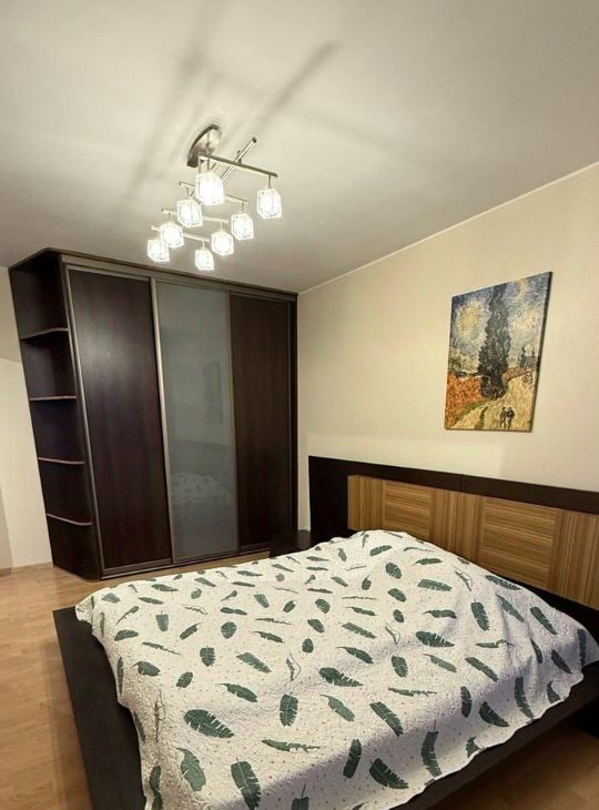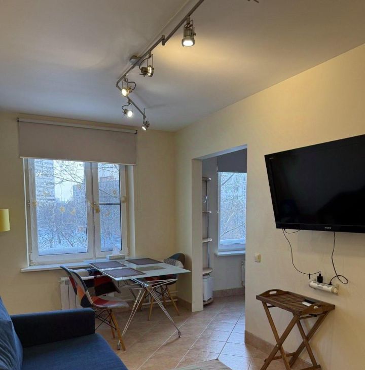 Квартира полностью меблирована: в гостиной — комфортный диван, обеденная зона и телевизор; в спальне — большая двуспальная кровать, телевизор и вместительный шкафкупе. Кухня оснащена всем необходимым: гарнитур, варочная панель, духовой шкаф, вытяжка, холодильник, и базовая бытовая техника. Остеклённая лоджия может использоваться как место для отдыха или хранения.