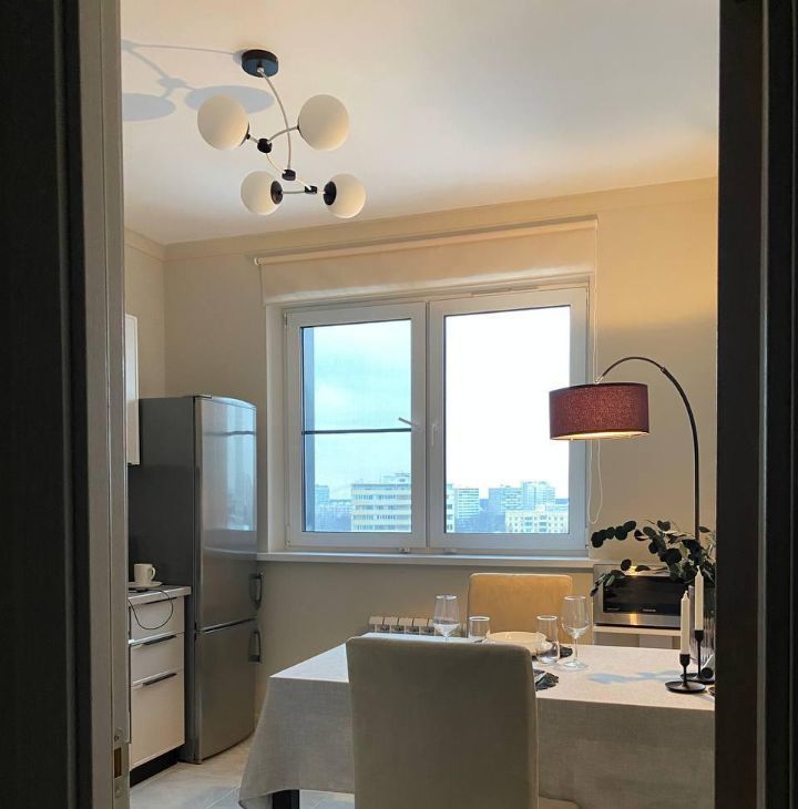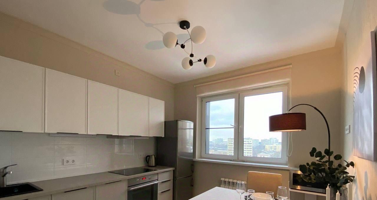 Кухня площадью 12 м² оснащена всей необходимой бытовой техникой, включая телевизор с кабельным/цифровым ТВ. Из окон открывается потрясающий вид на городскую панораму, особенно впечатляющий в вечернее время с видом на парк и Останкино.
