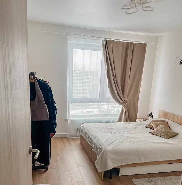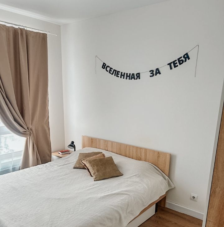 Спальня — полноценная зона отдыха с кроватью и ортопедическим матрасом, вместительным шкафом и вешалкой для одежды. Окна оформлены тюлем и плотными шторами black out — идеальны для спокойного сна в любое время суток.