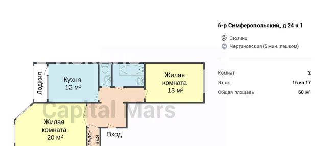 2-к кв. Москва Симферопольский бул., 24К1 (60.0 м²)