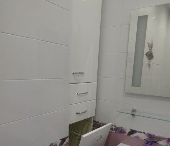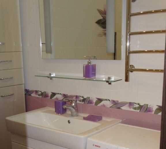 - Комфортная ванная комната укомплектована мебелью и стиральной машиной