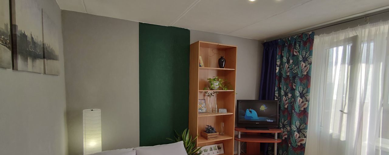 В другой комнате раскладной диван, стеллаж и узкий шкаф. Рабочий стол. Телевизор.