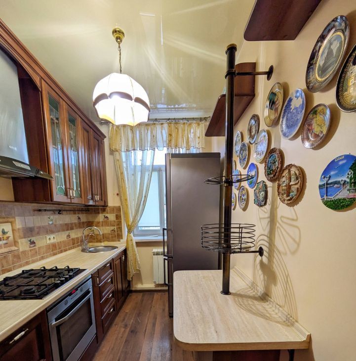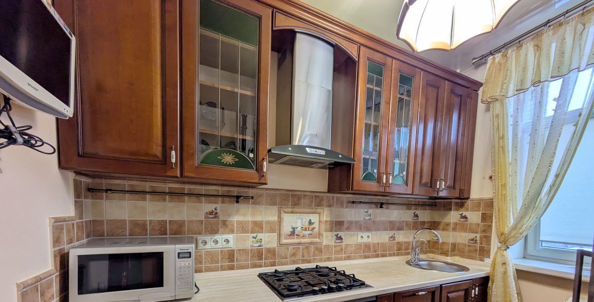 Итальянская кухня из массива,уютная обеденная зона. Квартира меблирована всей необходимой мебелью и техникой (варочная газовая панель, духовой шкаф, кондиционер, стиральная машина, кровать 120*200, вместительные шкафы). Балкон остеклен, окна выходят на Ипподром.