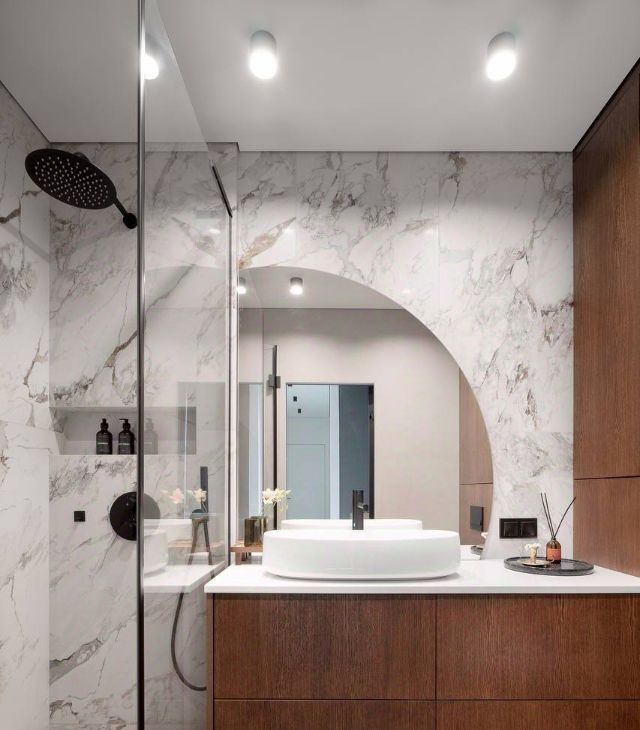 Французский балкон, санузел с душем walk-in и крупным керамогранитом.