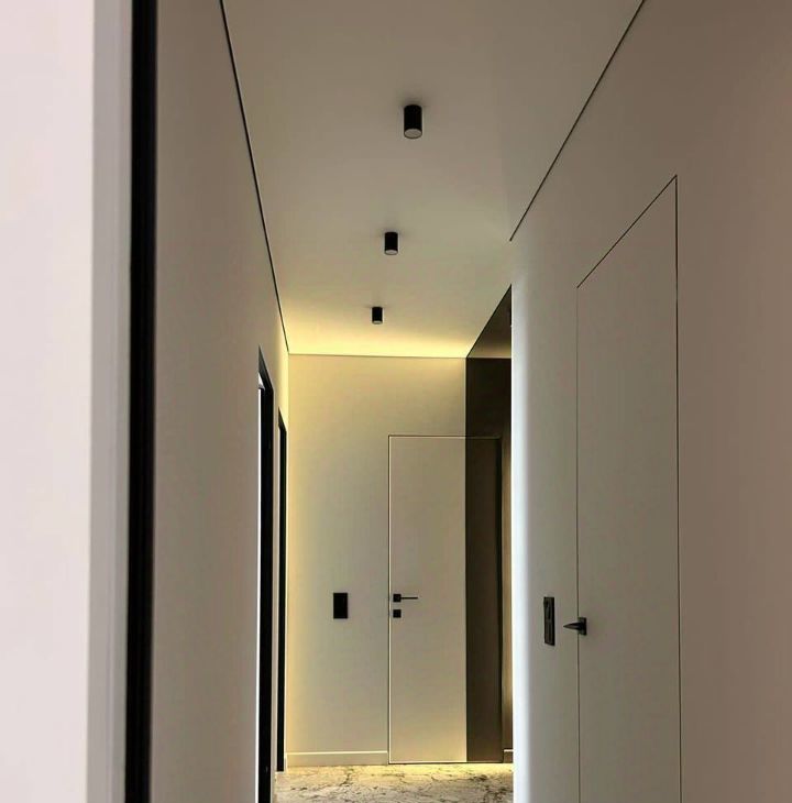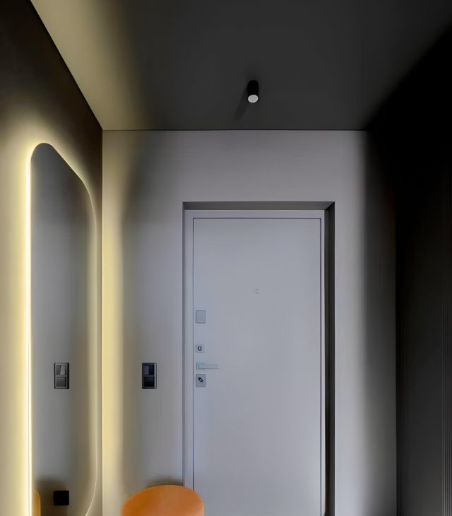 Паркет ёлкой, графитовые стены, продуманный свет в треках и нишах, кондиционирование по комнатам.