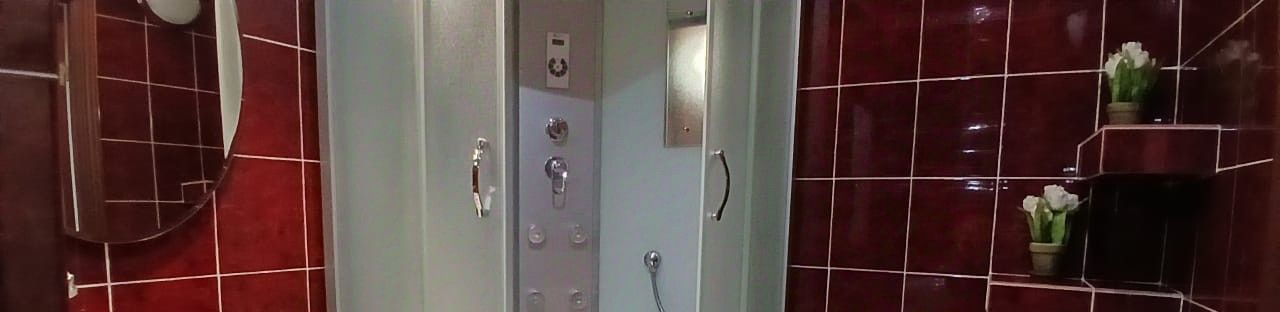 С душевой кабиной, раковина, унитаз.