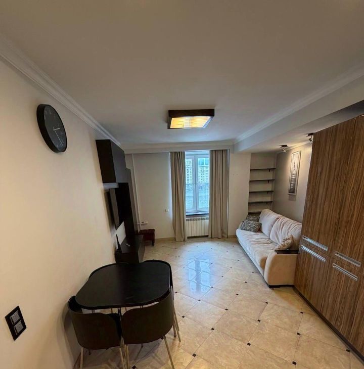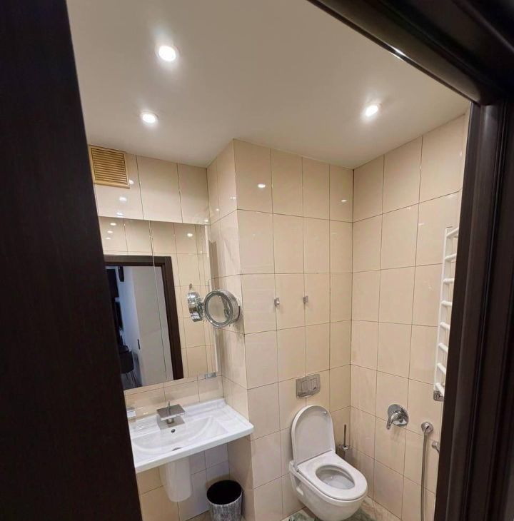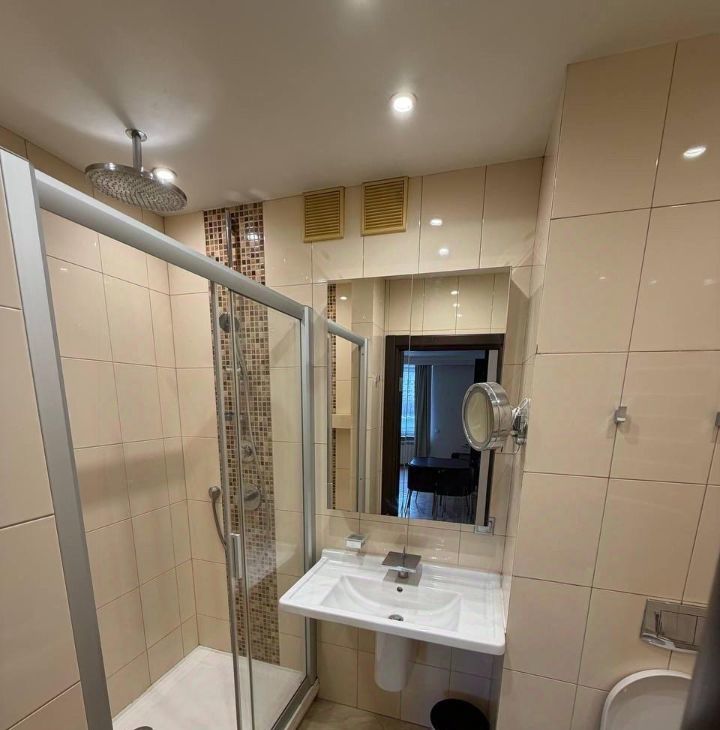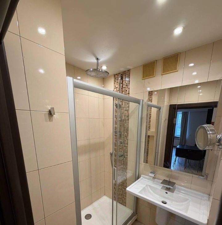 В квартире сделан дизайнерский ремонт, что создаёт атмосферу уюта и комфорта. Кухня площадью 15 кв. м оборудована всей необходимой мебелью и техникой — здесь есть холодильник, посудомоечная машина и кондиционер. В ванной комнате установлена душевая кабина, поэтому можно быстро освежиться в любое время. В комнате также есть мебель, а в гостиной — телевизор и стиральная машина. Для удобства жильцов в доме работает пассажирский лифт и есть мусоропровод.