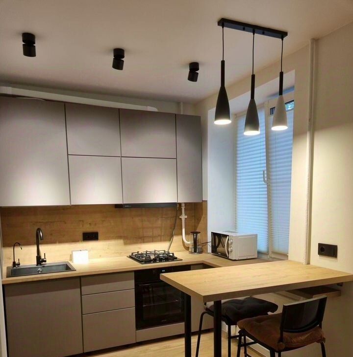 Кухня-гостиная оборудована всей необходимой техникой: холодильник, газовая варочная панель, духовой шкаф, микроволновая печь. В зоне гостиной — диван и обеденная группа.