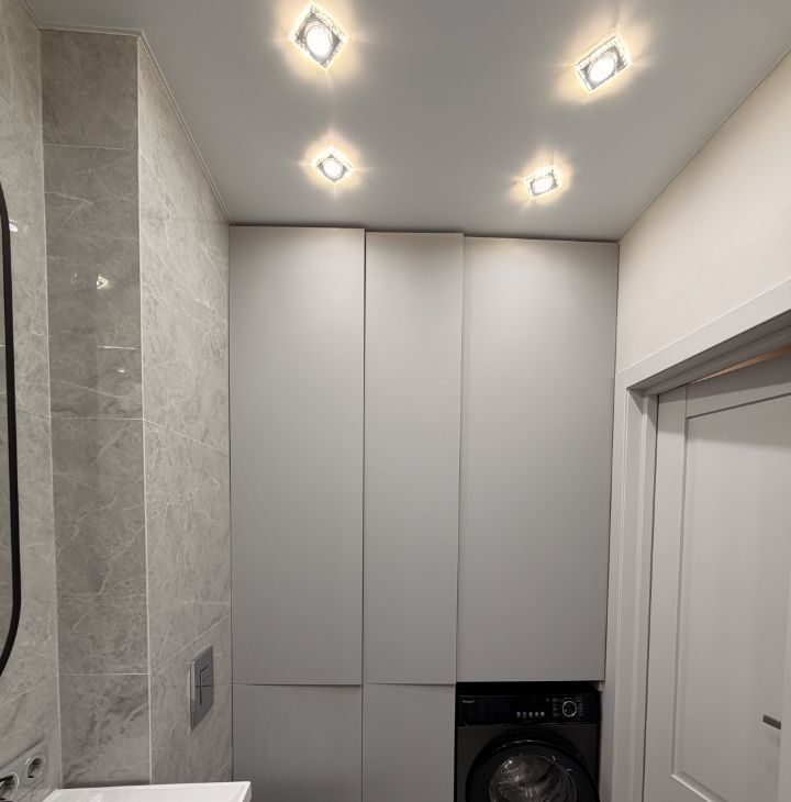 Стиральная машина разместилась в ванной комнате, которая вмещает