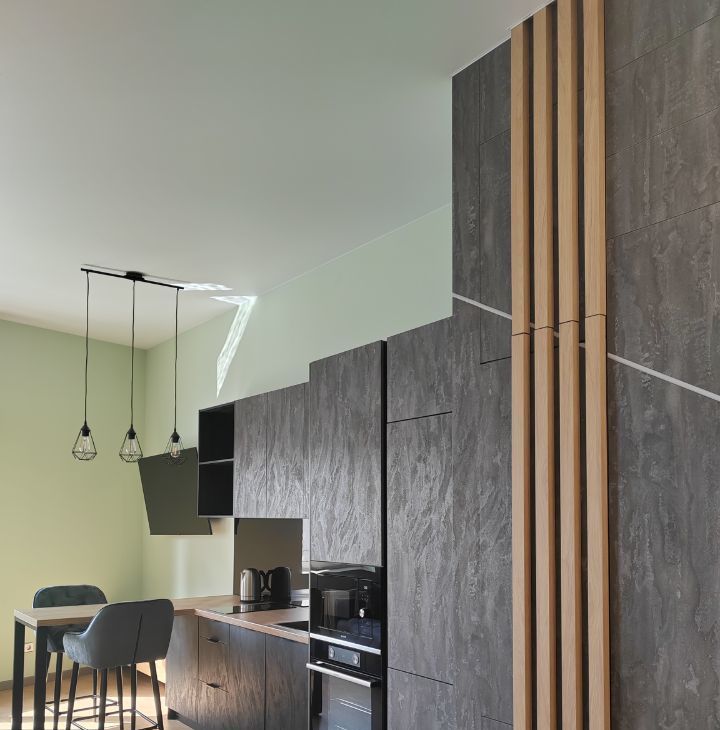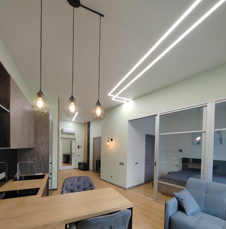 -Дизайн квартиры с интересными решениями, который дополнен мебелью изготовленной на заказ со встроенными светодиодными линиями.