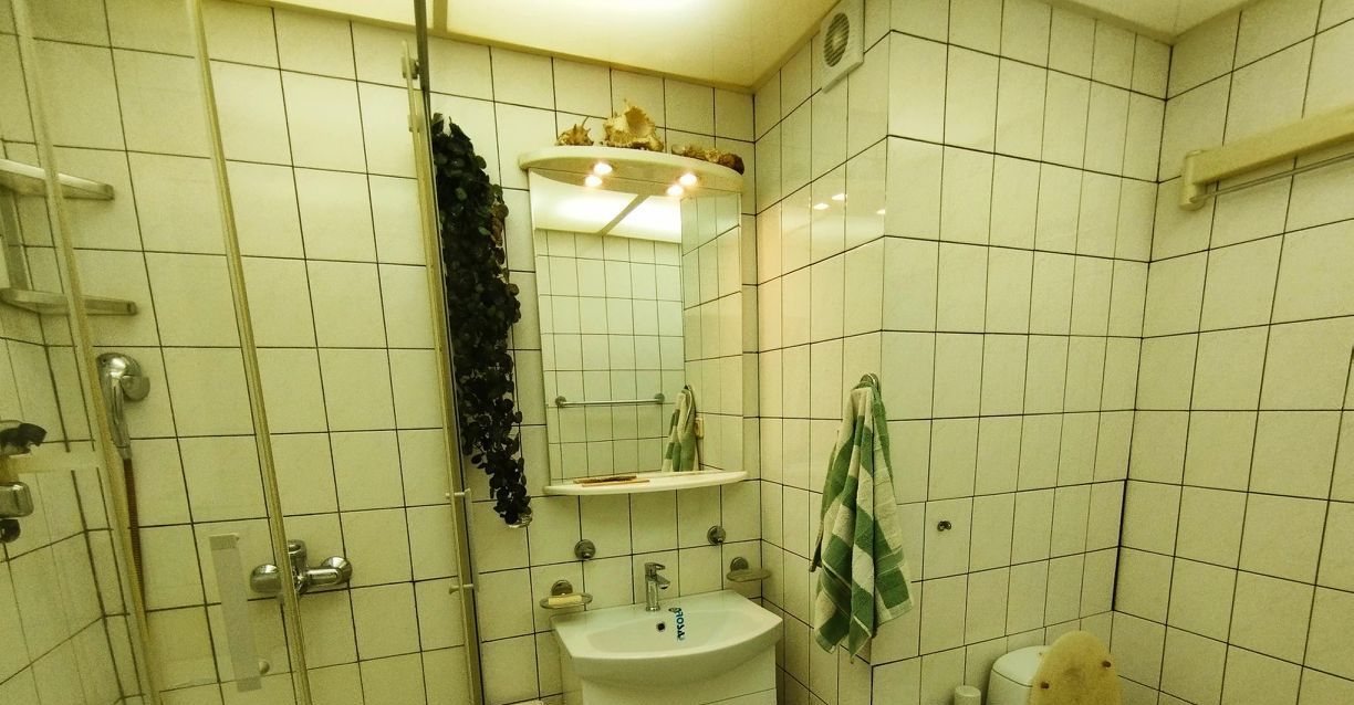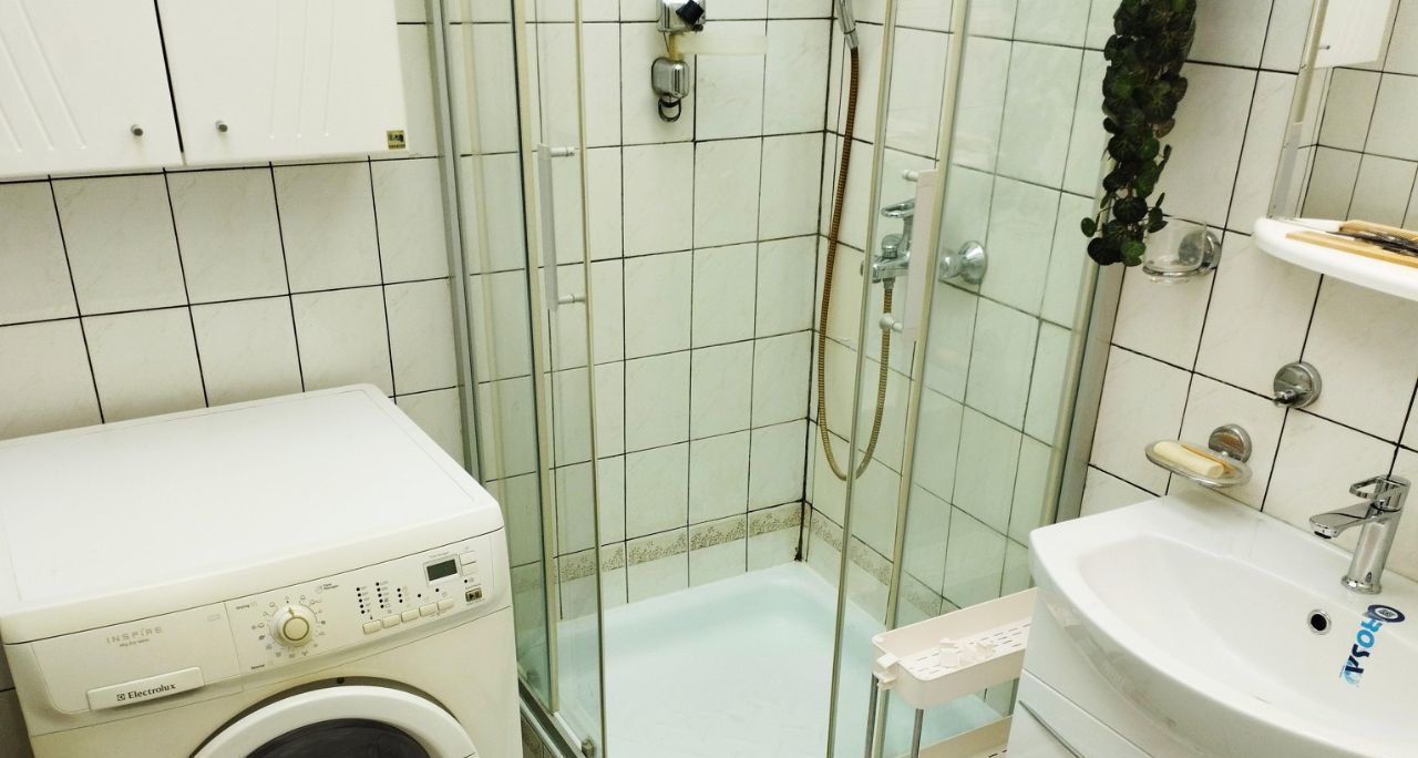 Санузел совмещённый в отличном состоянии с душем, установлена стиральная машина.