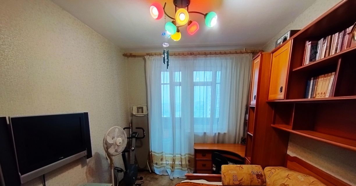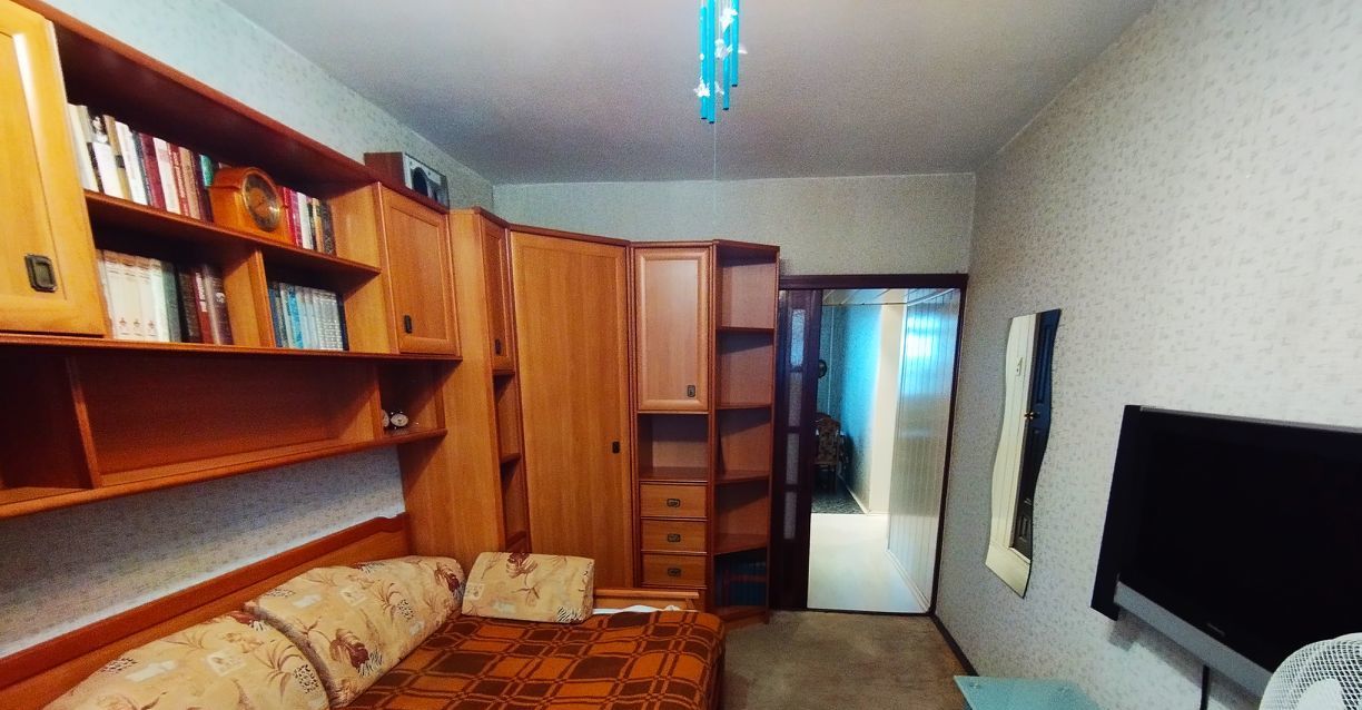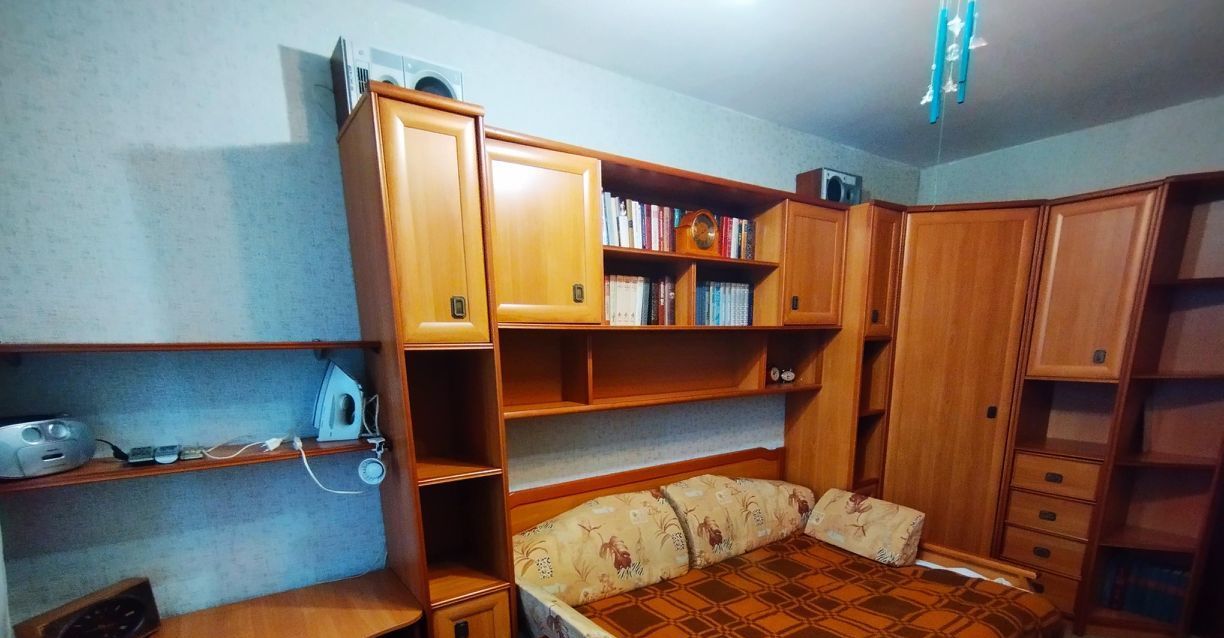 В спальне мебельный гарнитур с софой и письменный стол, тумба под тв, телевизор.