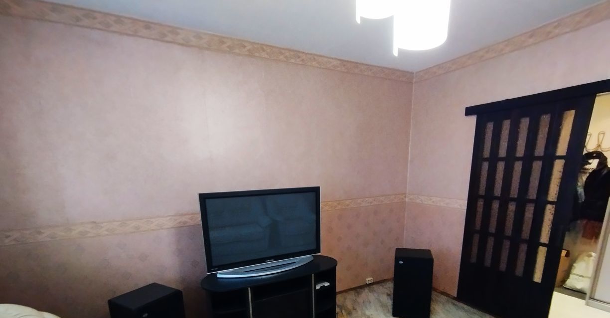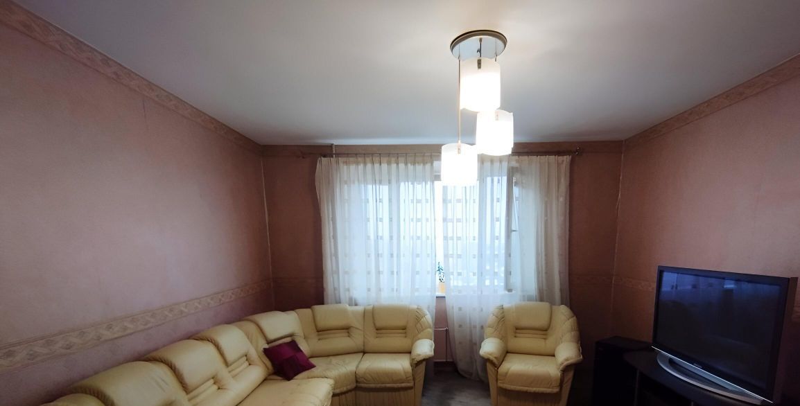 В большой комнате угловой раскладной диван, два кресла, тумба под тв, телевизор.