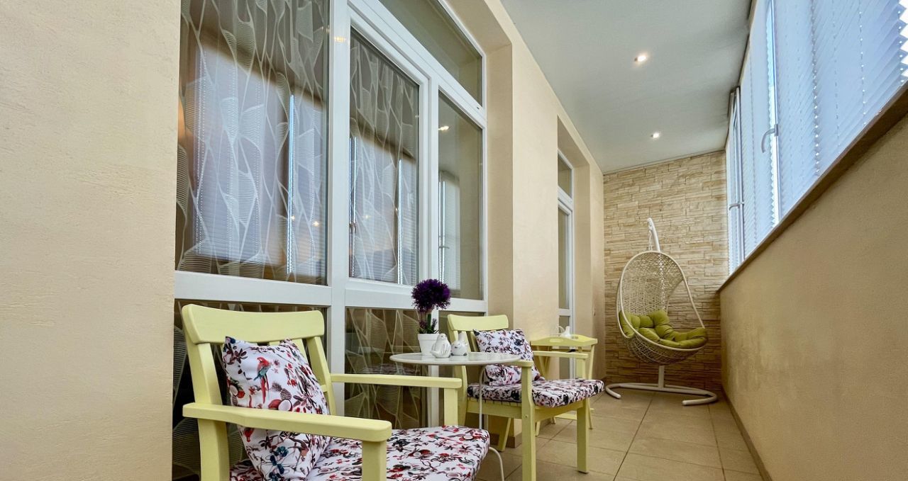 Шикарная лоджия с потрясающим панорамным видом, выход на которую с кухни-гостиной и спальни!