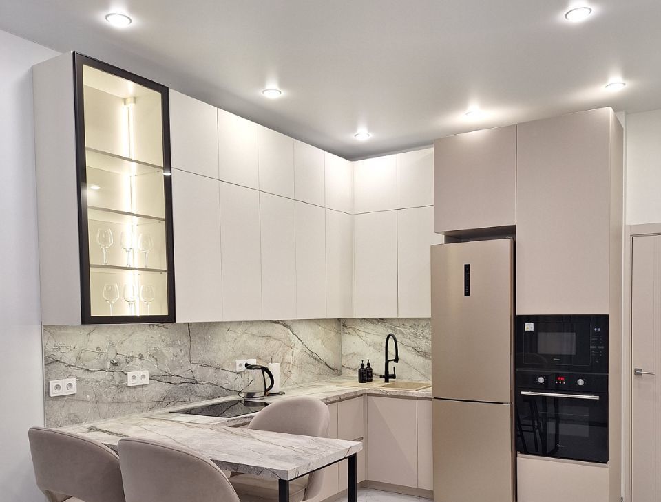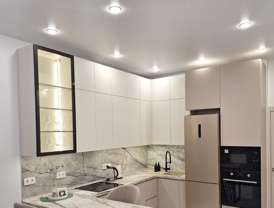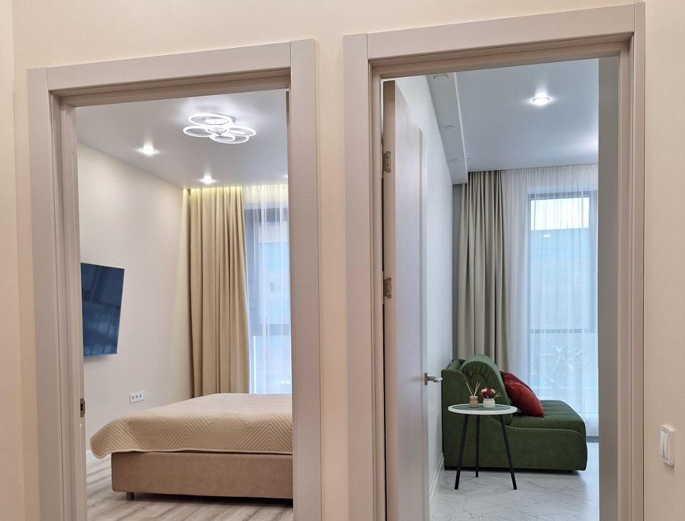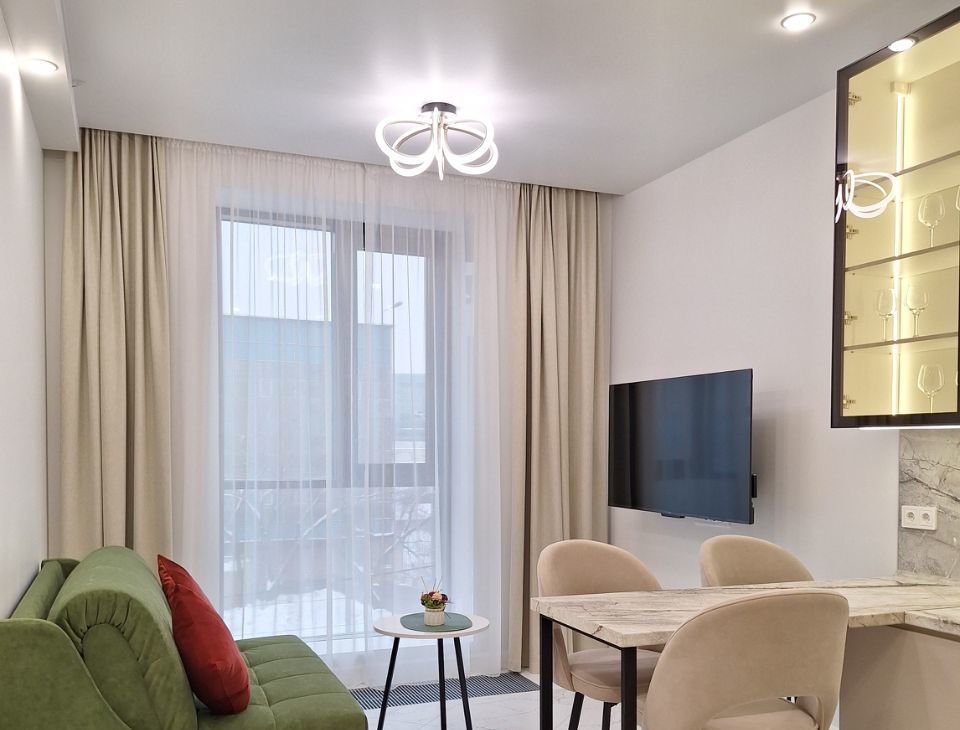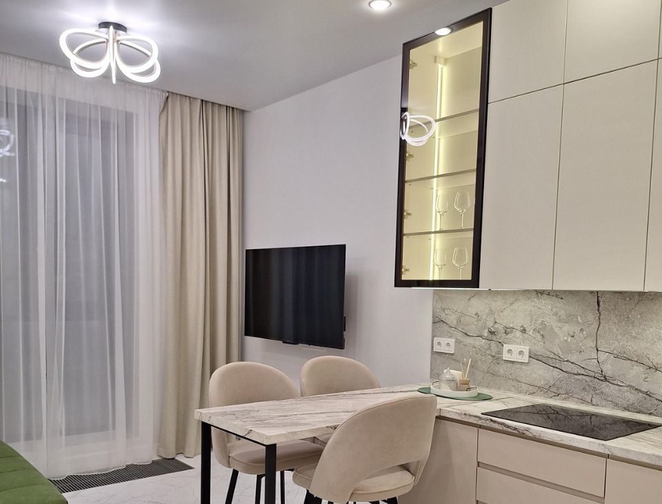 В кухне- гостинной: вместительный кухонный гарнитур до потолка; диван раскладной с комфортным матрасом и полноценным двуспальным местом; большой телевизора, работает через яндекс ( команды выполняются голосом через " Алису"). Также вся кухонная техника абсолютно новая: индукционная 4х-конфорочная варочная поверхность, встроенные микроволновая печь и духовка, посудомоечная машина на 12 комплектов посуды, встроенная вытяжка, подсветка рабочей зоны, фильтр для проточный воды в смесителе, также холодильник.