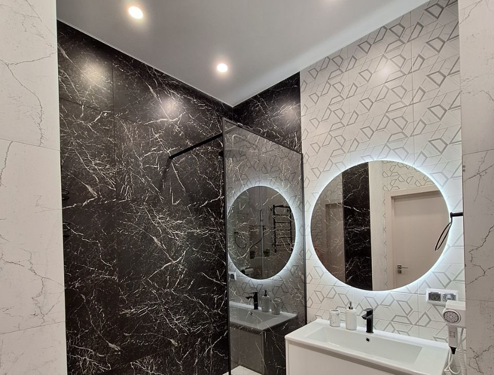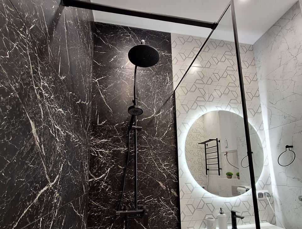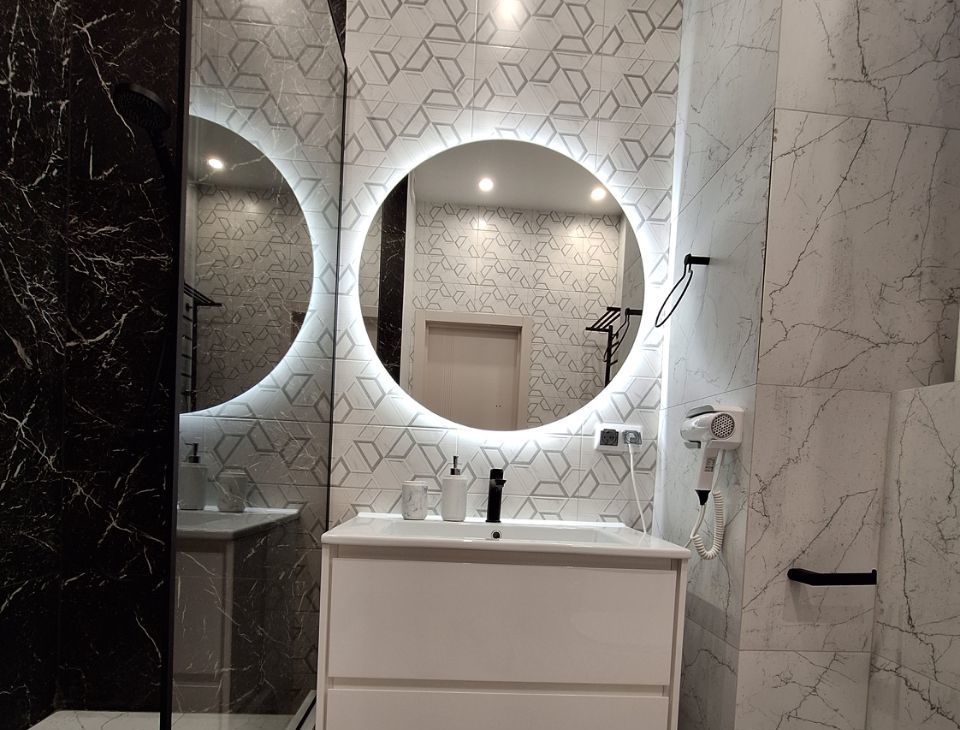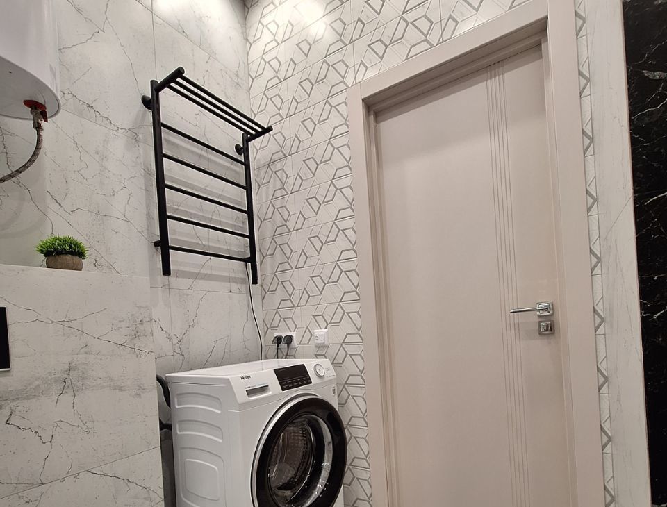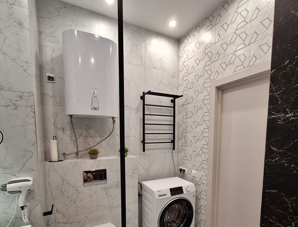 В ванной новая стиральная машина 4560, бойлер на 80 литров ( включать по необходимости при отключении горячей воды), большое зеркало с подсветкой, встроенный фен, сушилка для белья, электрический полотенцесушитель, электрические тёплые полы.