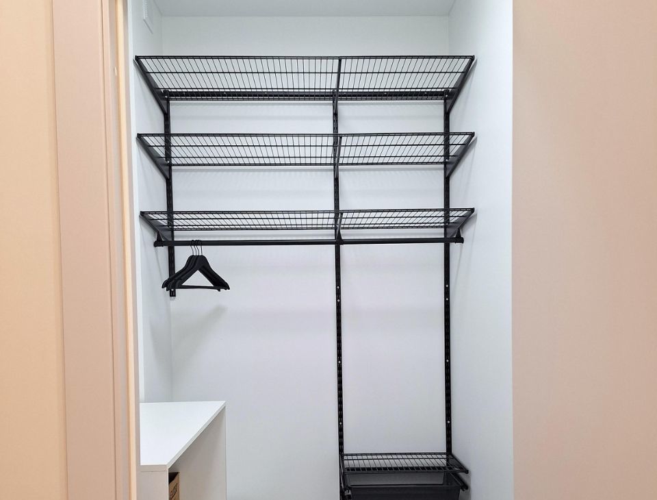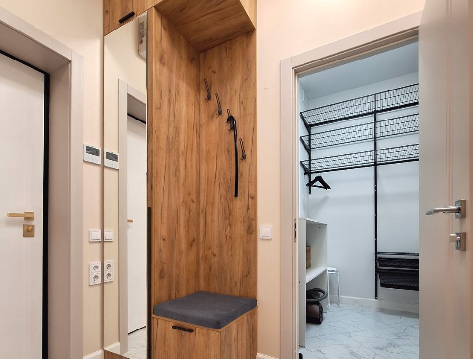 Просторная прихожая и кладовка с встроенной гардеробной системой.