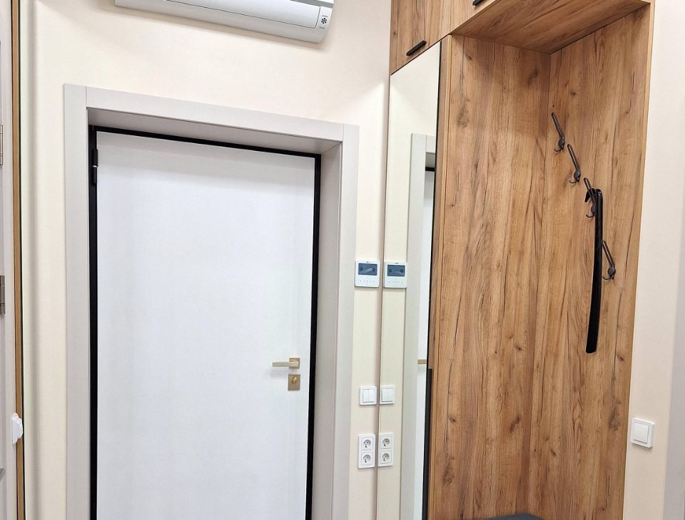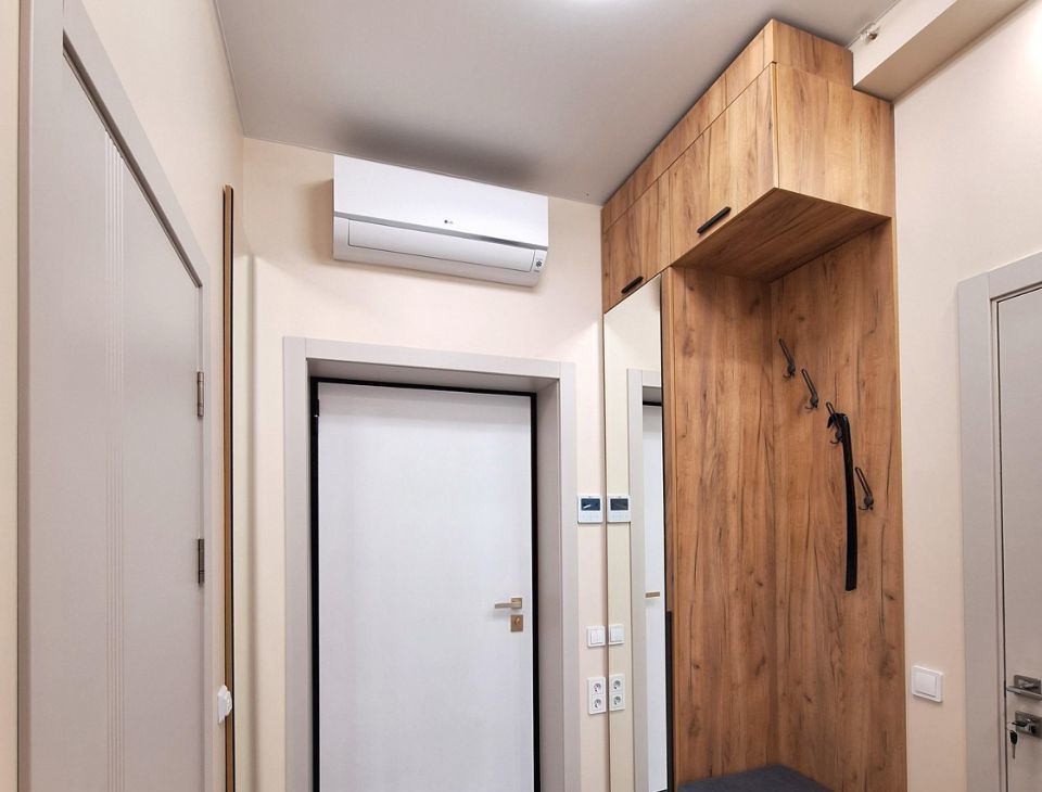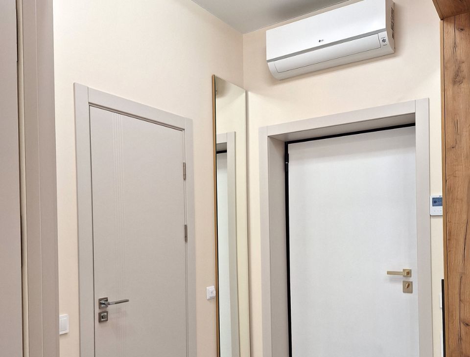 Кондиционер в прихожей, направлен на обдув обеих комнат ( спальни и кухни).