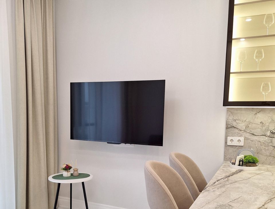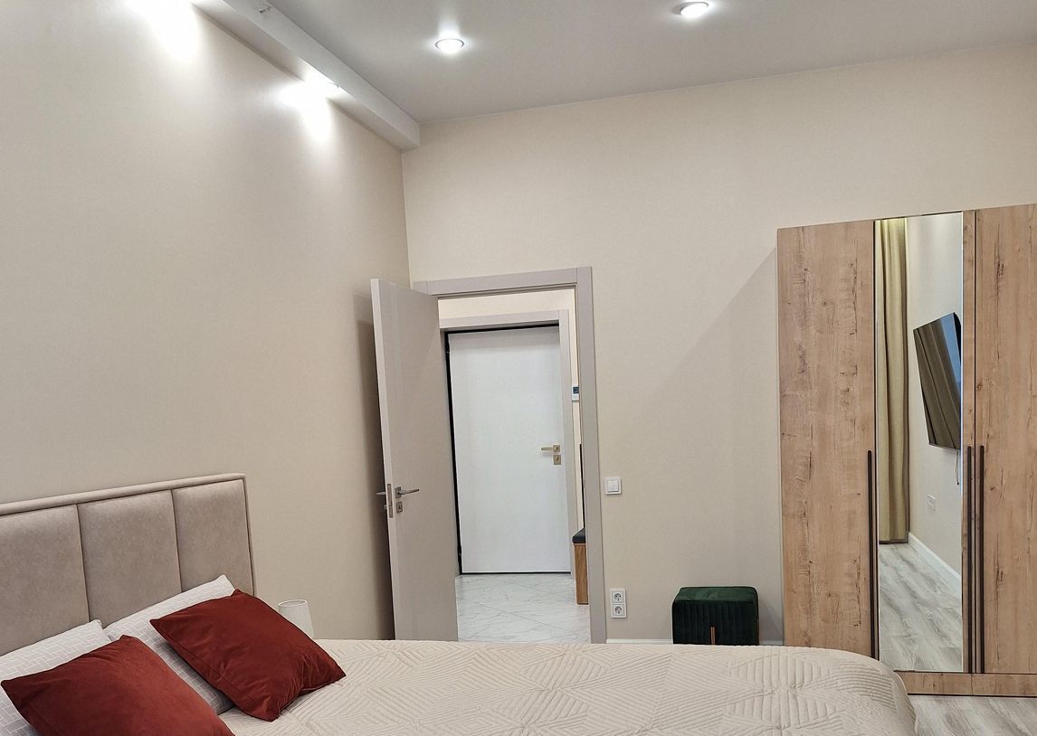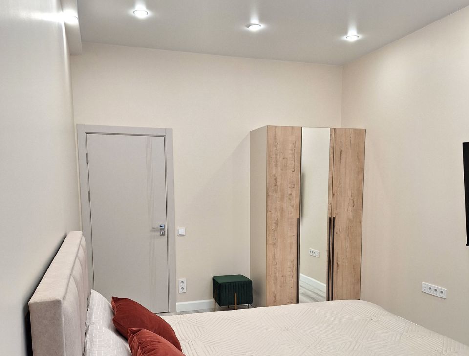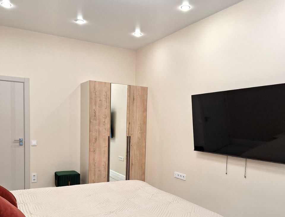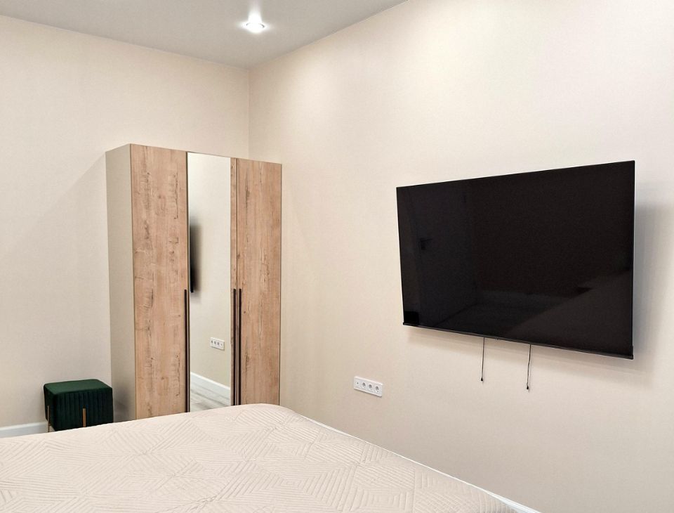 В спальне: кровать с подьемным механизмом Ascona, матрас Ascona+ наматрасник; шкаф 3-хстворчатый для одежды; 2 прикроватные подвесные тумбы; пуфик; большой телевизор со smart- tv.
